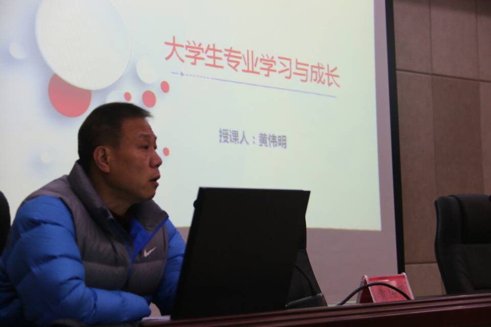 的院长黄伟明,他的主讲内容是“大学生专业学习与成长”。在该次讲座中,黄伟明院长围绕当代大学生现状、体育专业学习、成长方式三个方面展开,首先向同学们阐明了学习和生活中“学+问、悟”的意义然后深入的和同学们探讨如何适应大学生活,讲座后期,他明确指出,“年轻便是拼命学习的资本”。他以一些杰出学长、学姐为例,讲述他们成功的历程,进而激励学生勤奋学习、努力奋斗,深思自己的大学生涯,树立坚定不移的目标。