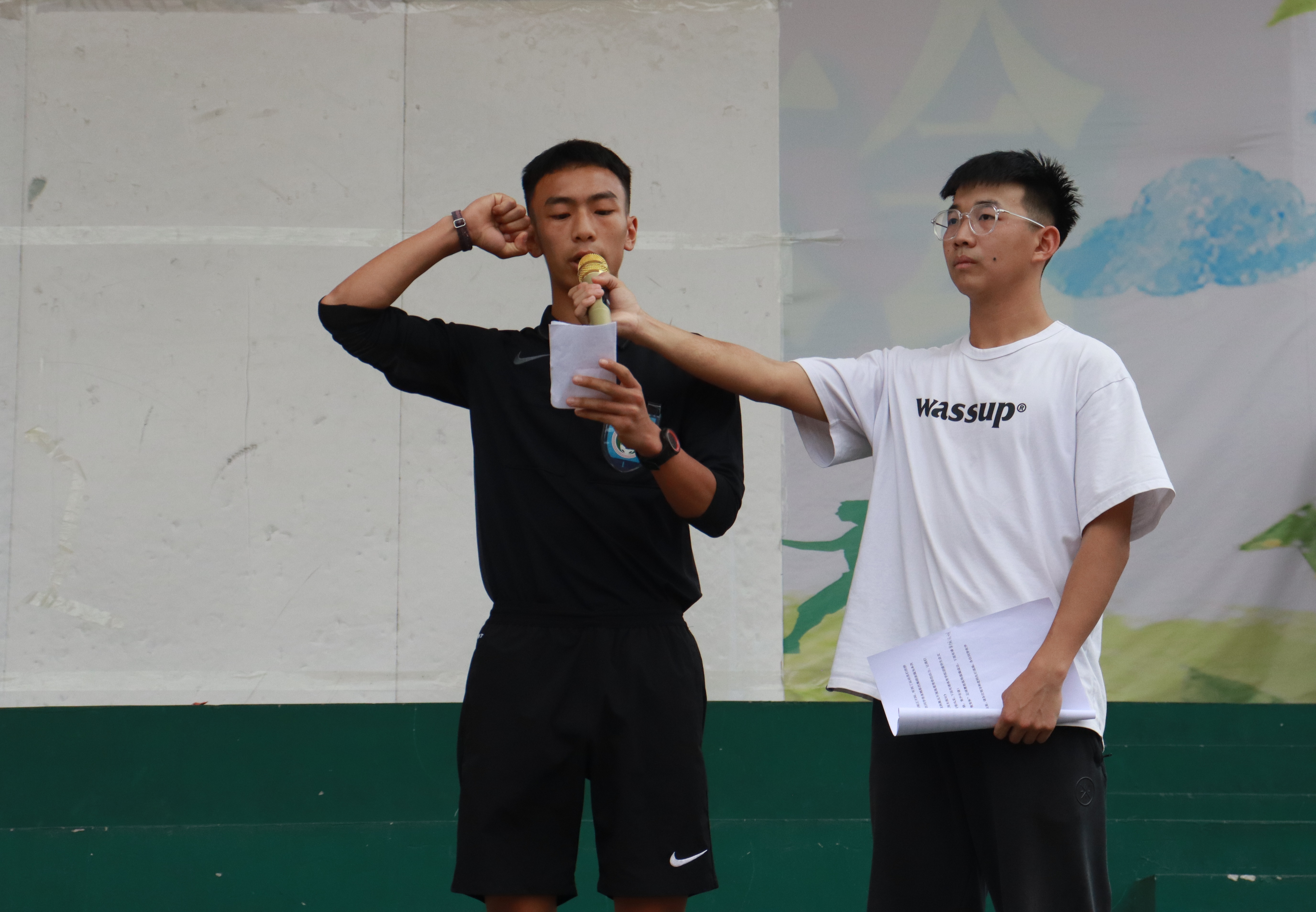 首先,全体起立,奏唱中华人民共和国国歌;随后,韩山致欢迎词,对本届足球盛会表示衷心的祝贺,对为筹备比赛付出辛勤劳动的工作人员表示诚挚的感谢,期望大家以比赛为契机,充分展示自身所学技能,增进与各班级间、各学院间的交流学习,并共同推动学校体育事业的发展,期望全体运动员严守赛风赛纪、尊重裁判、尊重对手、尊重观众,用精彩的比赛彰显足球运动魅力,把本届比赛办成一次“安全、和谐、团结、精彩”的盛会。裁判员代表孙成坤和运动员代表云明才分别进行庄严宣誓。