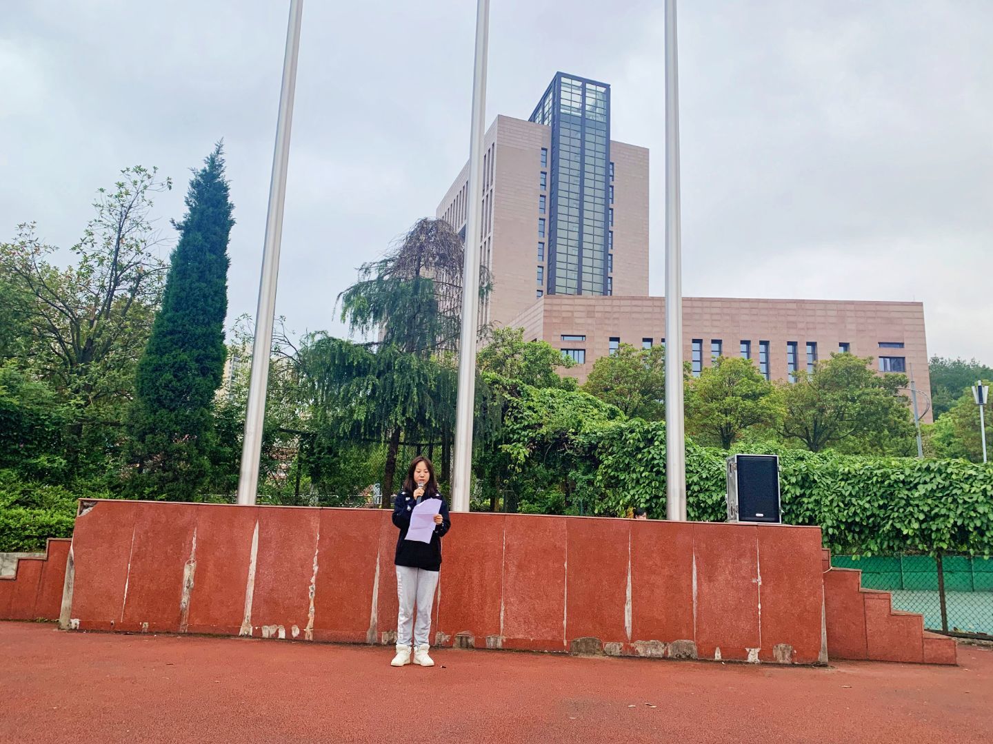 在足球场举行第八周升国旗仪式。为响应国家防疫措施,此次升旗仪式安排了49名同学参加。