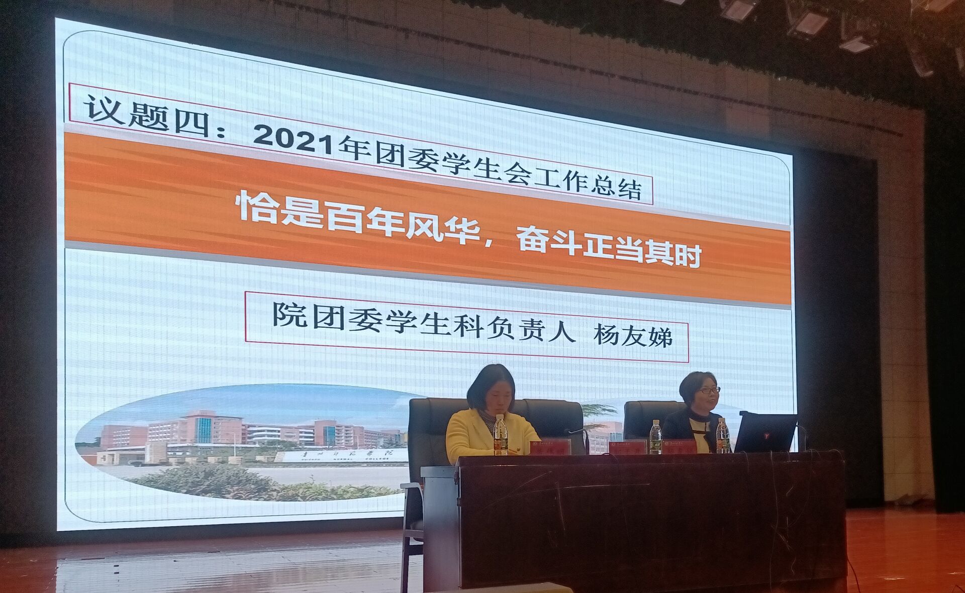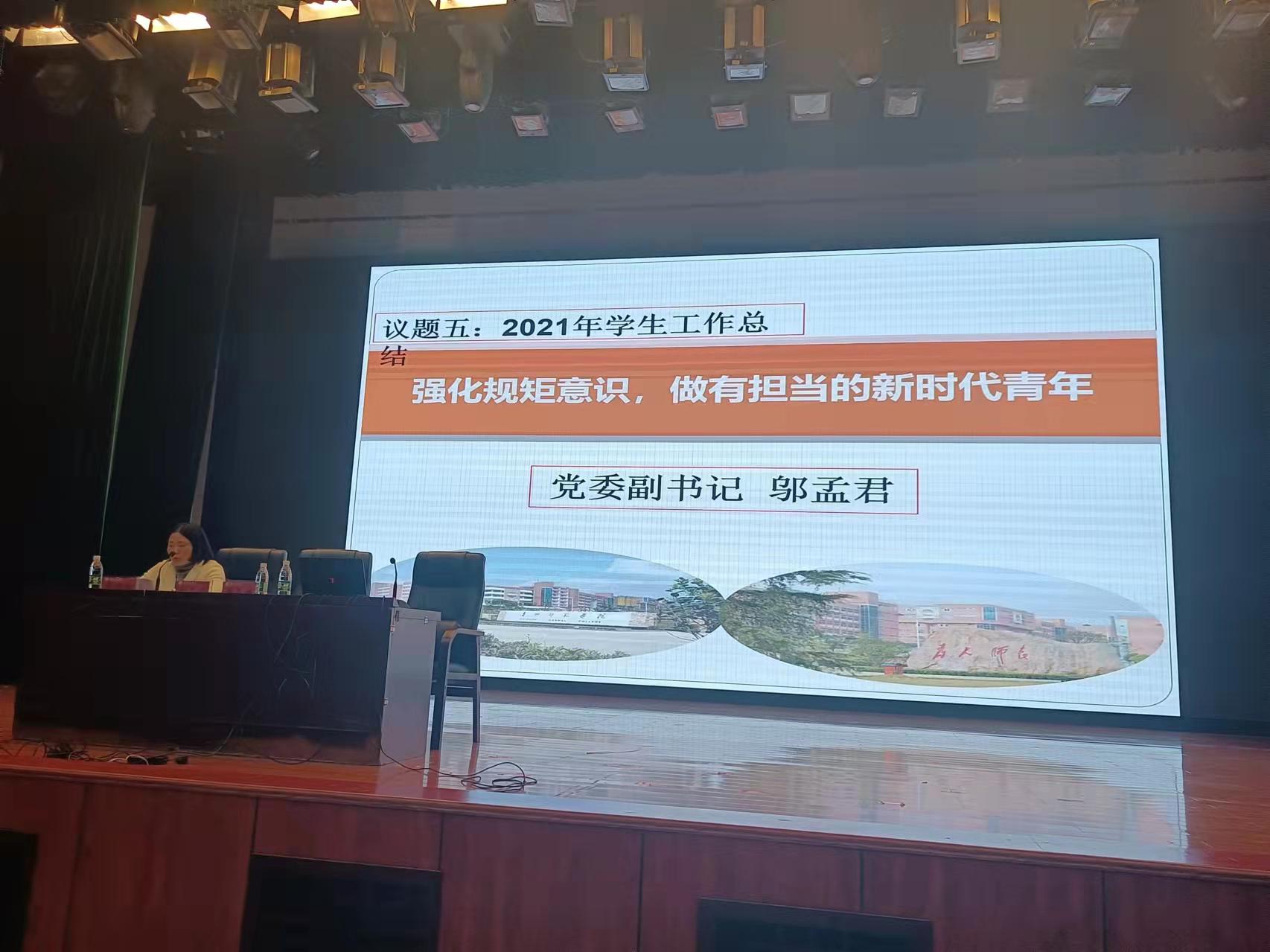 会议第四项议程由团委学生科杨友娣做团委学生会工作年度总结。杨友娣从团建、学生活动、存在的问题等方面对整个年度的工作进行了总结。同时党委副书记邬孟君以“强化规矩意识,做有担当的新时代青年”为主题从学生思想教育、团建和学生活动、学生管理常规等方面对整个年度的学生工作进行了总结。她表彰了先进,通报了整个年度违纪违规的学生情况,同时安全、学习、考试、同学相处等方面提出了相关要求。
