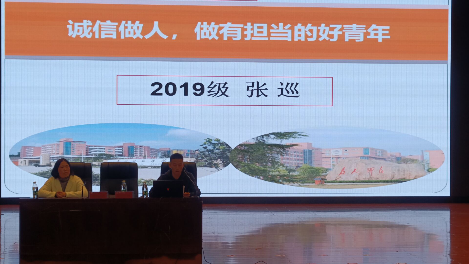 会议第六项议程由学生代表2019级体育教育专业张巡代表全体同学做“诚信做人,做有担当的新青年”主题发言。他从认真复习、积极备考,端正态度、切记浮躁,严守考纪、严于自律,文明考风、诚信应考四个方面进行了表态发言,呼吁大家用心对待人生中的每一场考试。
