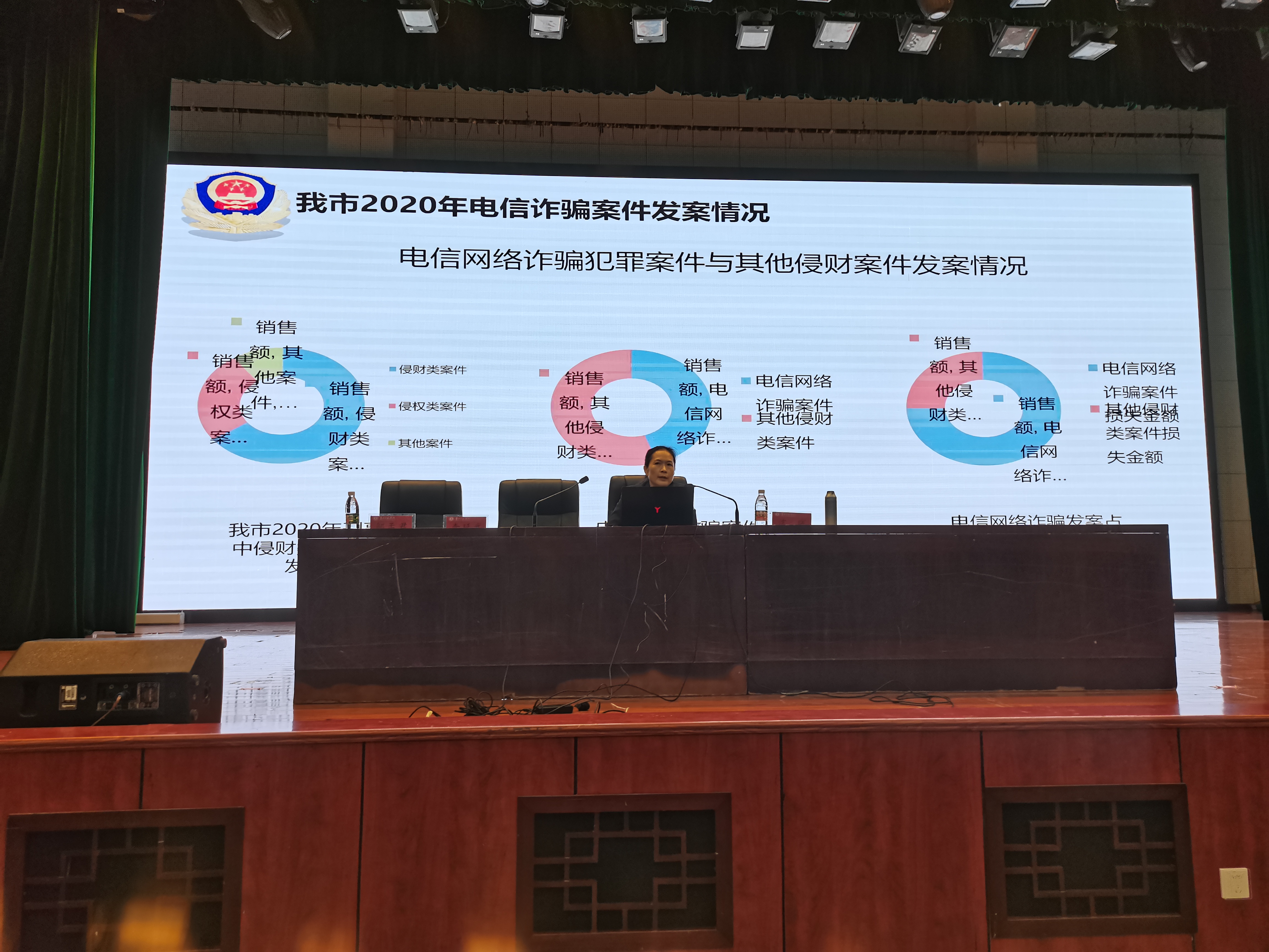 会议第一项由贵阳市反诈中心副主任沈晖给全体同学进行了反诈骗的专题讲座。沈主任从什么是电信诈骗,近期高发的电信诈骗手段、过节惩戒措施及段卡行动、电信诈骗的补救措施四个方面用生动、深入的案例告知全体同学“天上不会掉馅饼,网上处处有陷阱,遇到利诱和恐吓,不听不信不转账”。