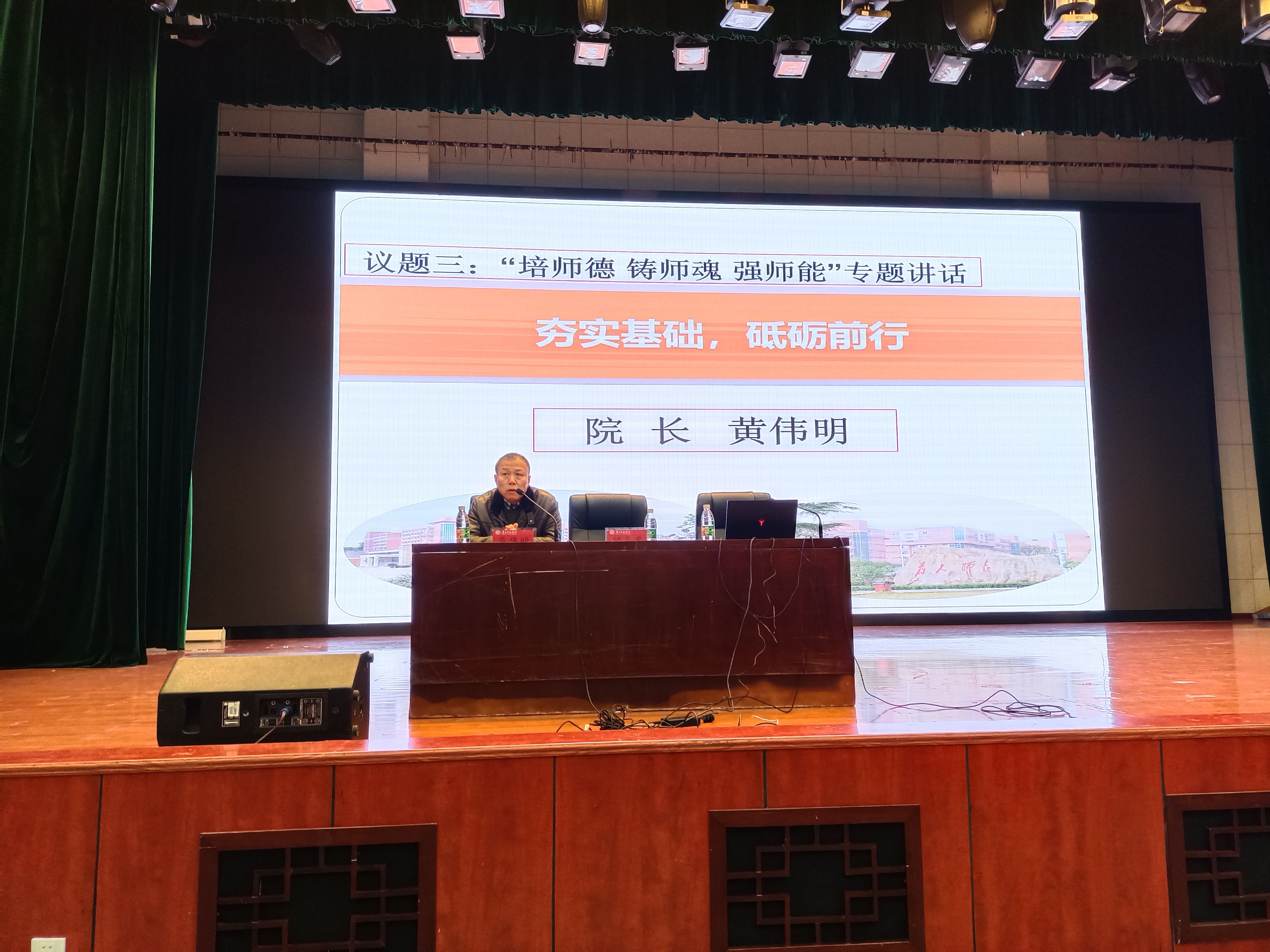 会议第三项议程由院长黄伟明做“夯实基础,砥砺前行”的专业学习教育。黄伟明用三十多年的经历告知同学们,在专业学习的道路上,要勤奋刻苦,懂得付出,舍得付出,静下心来,多学多思多练。