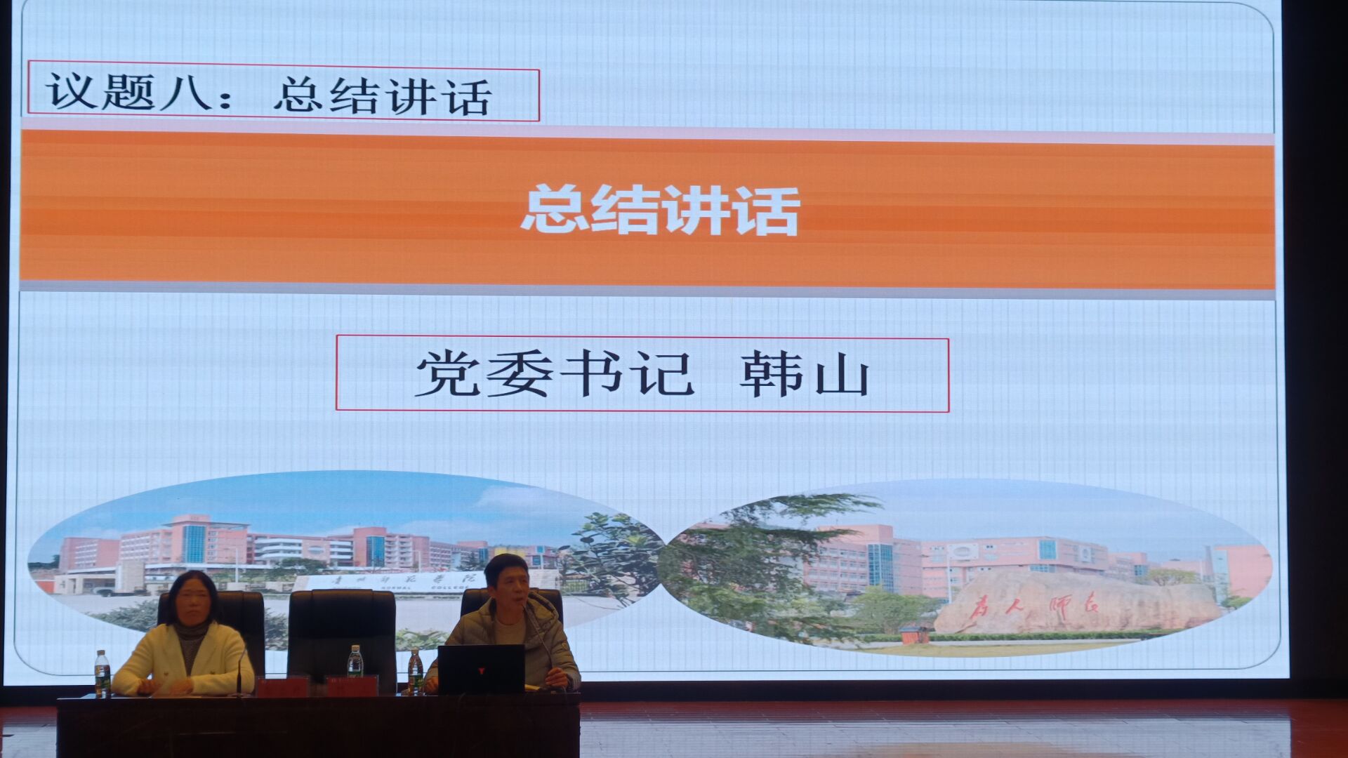 会议最后由党委书记韩山做总结讲话。韩山充分肯定了本次会议的重要性和效果,同时对所有领导的讲话进行了总结,最后以“珍惜青春岁月,用不懈奋斗谱写人生华章”为主题,从“奉献、知识、品行、坚强”四个方面以“高度、广度、厚度、深度”来成就“爱国者、勤学者、修神者、挑战者”四个角色。