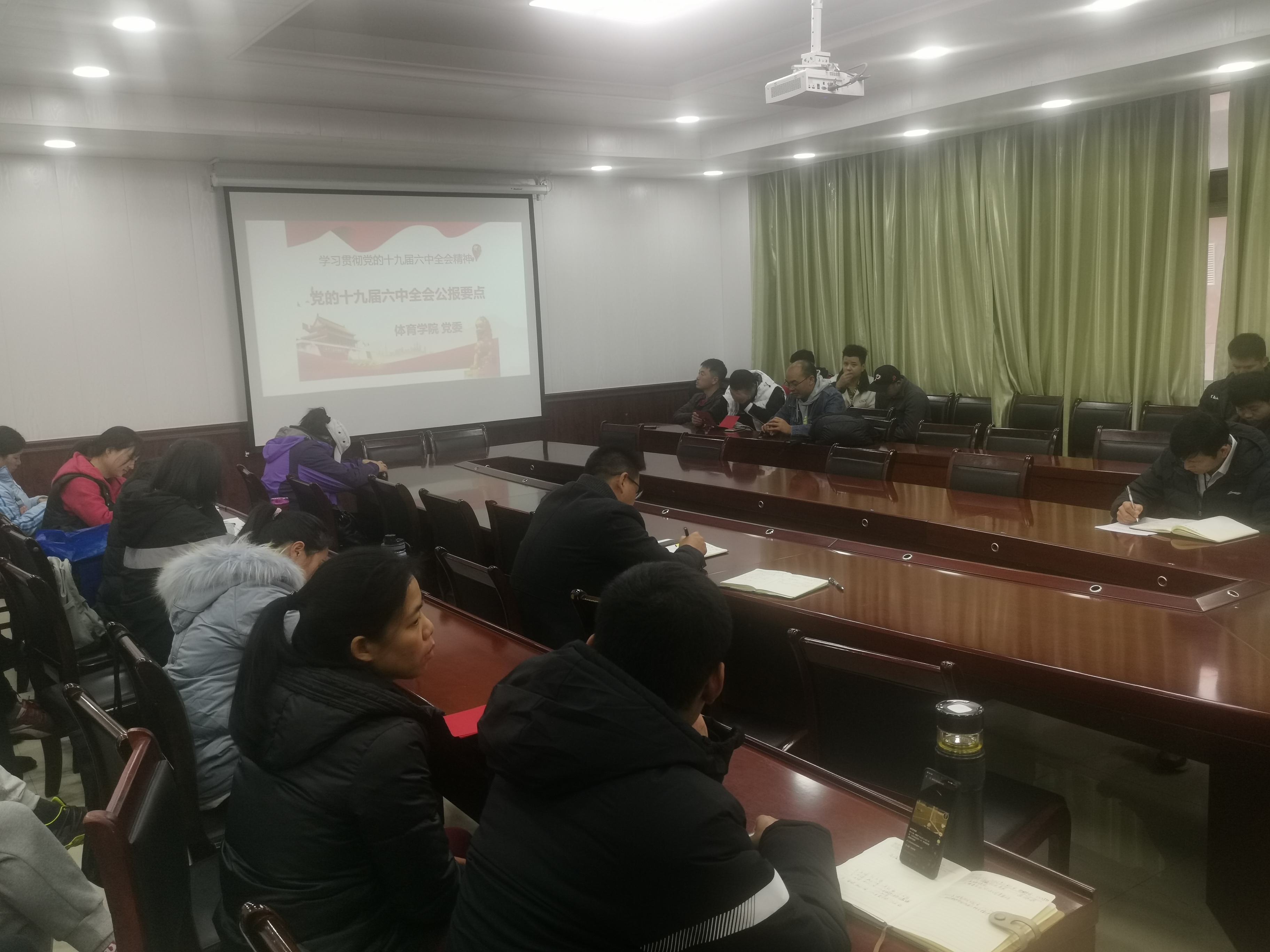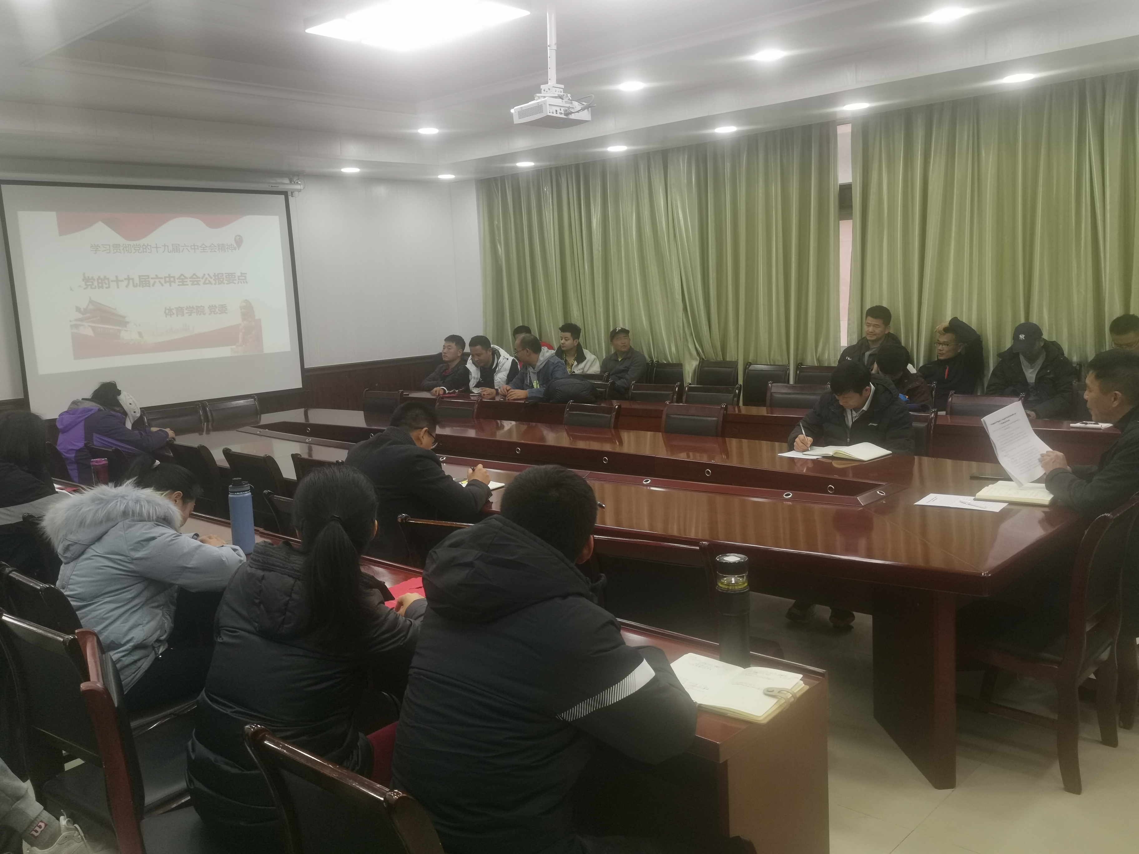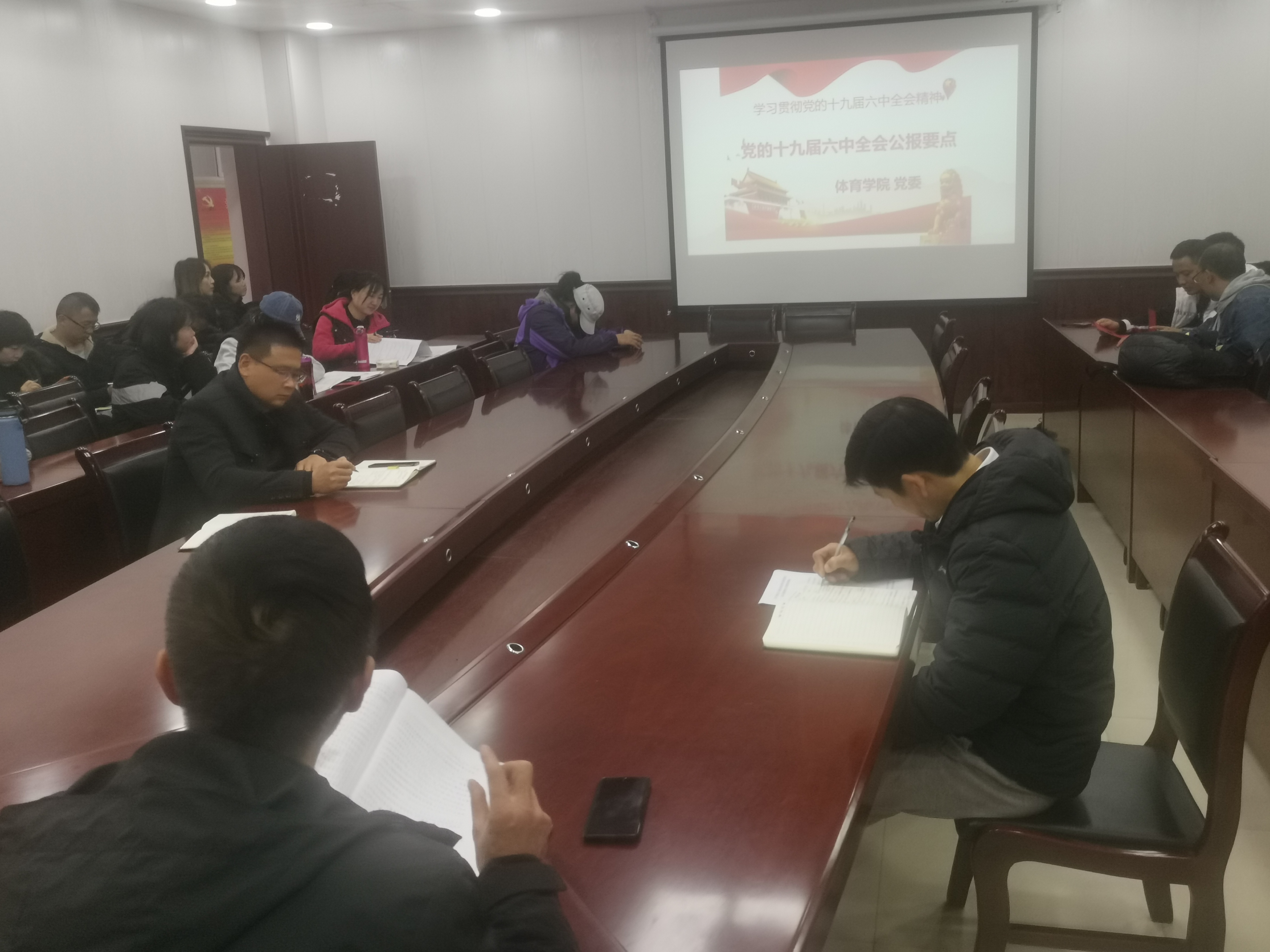 在学院会议室召开专题会议学习贯彻党的十九届六中全会精神。学院全体教职工参会,会议由院党委书记韩山主持。