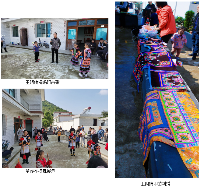 10:30左右,我们到达了谷金村,给老师们简单补充了水及面包后。我们来到王阿姨家中,欣赏她的刺绣手艺。谷金村上卡堡苗族自称“印苗”,其刺绣因独具少数民族文化特色被评为贵州省级非物质文化遗产。王阿姨给大家讲解了她刺绣图案的来源,然后展示了印苗服饰的穿戴法。最后王阿姨给大家清唱了一首印苗歌曲。谷金村上卡堡村民组这里还是苗族花棍舞的传承基地,11:30左右,我们有请到了当地的村民给大家展示了他们独有特色的花棍舞表演。伴随欢快的音乐,舞者灵活的步伐与手上的花棍融为一体,我们从舞者身上能想象到他们面对丰收时的喜悦情景。最后小朋友们跟随当地村民一起学习了花棍舞。
