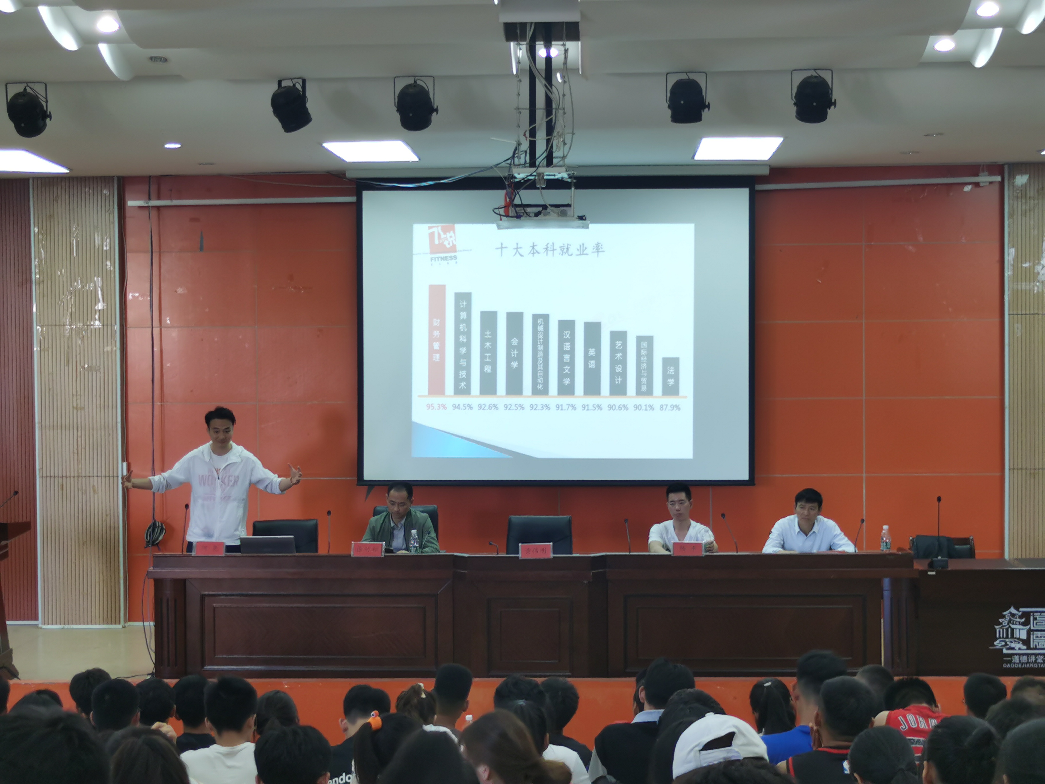 贵州飞锐体育发展有限责任公司的何尧、杨平两位总监分别从销售和健身两个方面分析体育公司员工应具备的素质及体育专业学生需努力的方向。徐竹松董事长从公司负责人的角度分析贵州乃至全国体育市场的发展状况,人才需求及发展趋势,希望体育专业学生读书期间全面发展,努力提升综合素质,为贵州体育的快速发展做出应有贡献。
