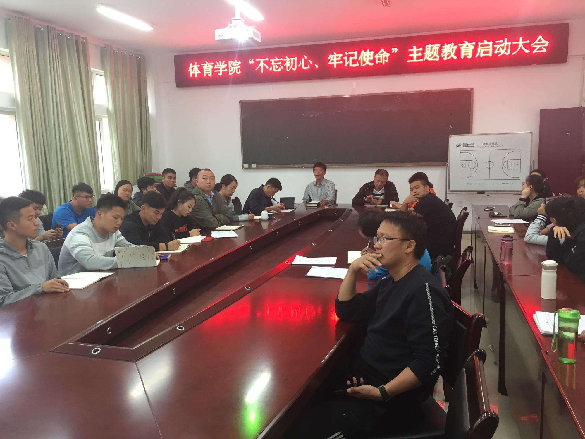 在学院会议室召开“不忘初心、牢记使命”主题教育启动会,院班子成员、党委委员、体育教育系、休闲体育系、学生支部支部书记及全体师生党员参加,会议由学院党委书记韩山主持。