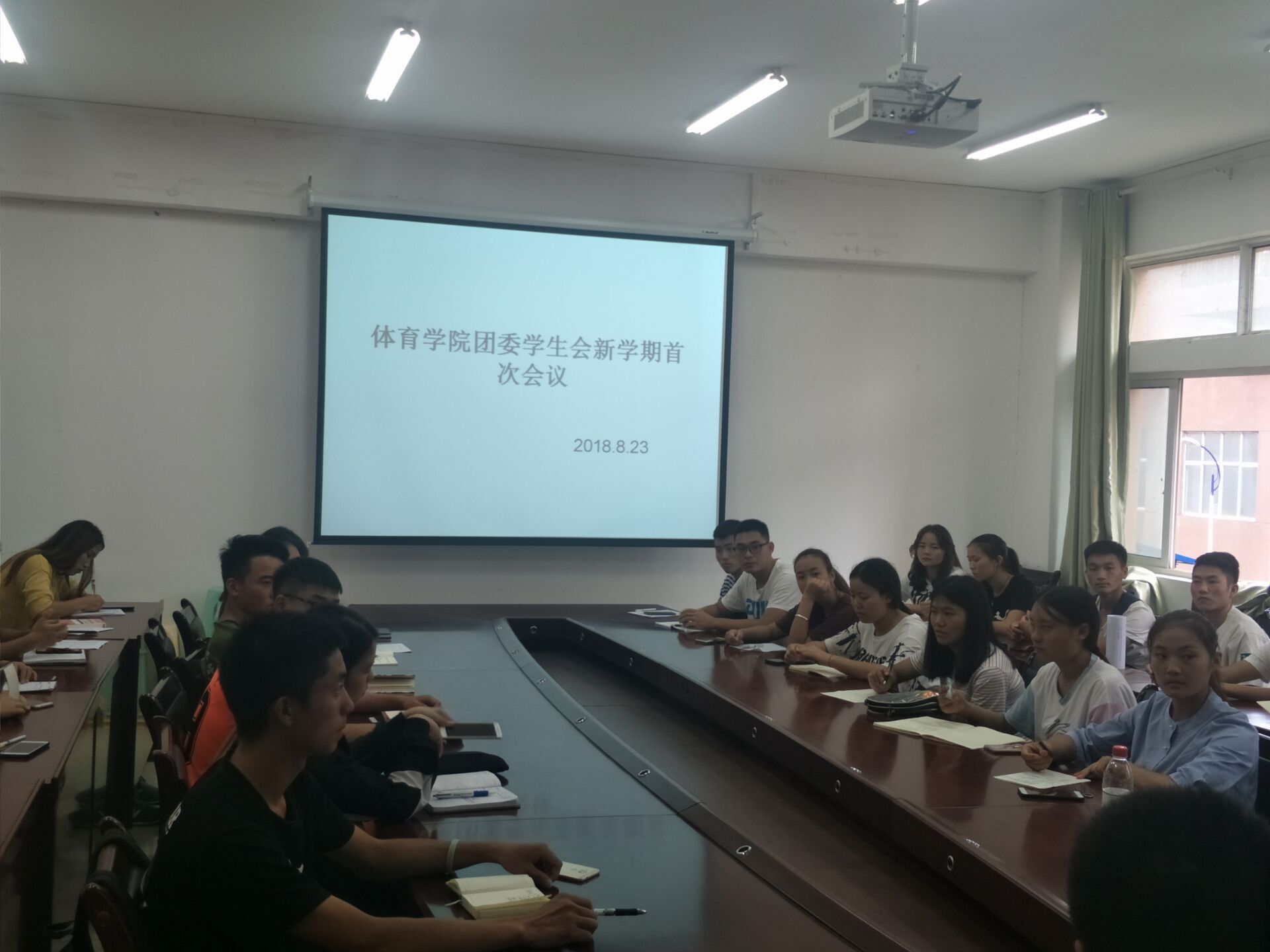 团委学生会新学期首次会议”。参加本次会议的有:党委书记韩山、原任团委书记刘华伟、现任团委书记张昕及学生会全体成员。