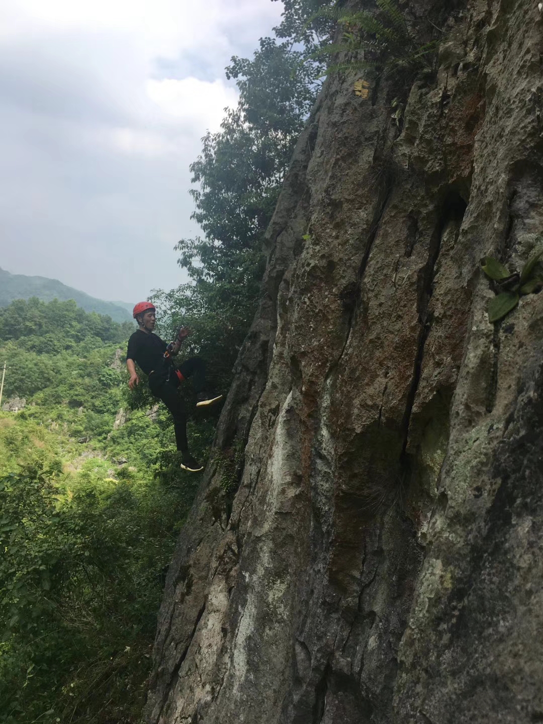 随后,我们进行了最后一个板块“野攀体验”。在高约30米的岩壁下,研学教育专业老师对基本绳索技术和攀岩与下降技术进行了培训,在专业人员的保护下开始攀岩。我院所有老师及学生都不同程度的参与了挑战,在刺激紧张与欢声笑语之中完成此项目,本次考察活动在充分感受自然、体验式学习氛围后结束。