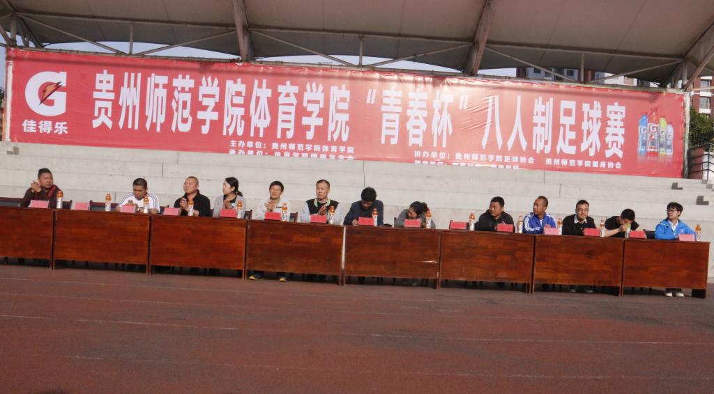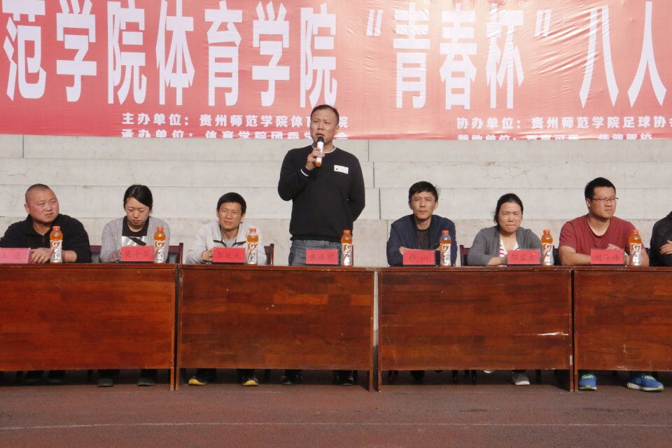 “青春杯”八人制足球赛在学校足球场顺利开幕。体育学院党委书记韩山、院长黄伟明、党委副书记邬孟君、团委副书记刘华伟、教师代表及赞助商代表出席了开幕式活动。