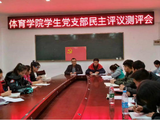 学生党支部民主评议测评会”。到会成员有党支部书记陈飞、全体党员和预备党员。
