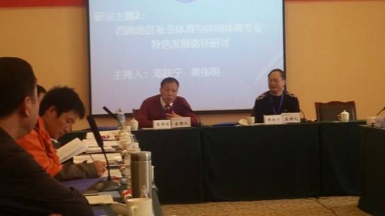 研讨会设立两个研讨主题:1、国家体育产业发展战略背景下社会体育与休闲体育专业发展的困境与对策;2、西南地区社会体育与休闲体育专业特色发展路径研讨。黄伟明院长做为特约主持人主持了第2个研讨主题,主持发言中分析了贵州省高校开办社会体育与休闲体育专业的现状,与参会人员共同分享了贵州省高校社会体育与休闲体育专业的特色发展路径,得到了西南其他省市与会专家的肯定。
