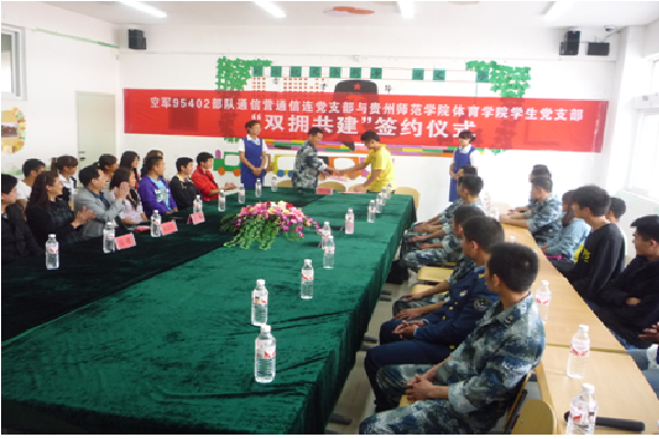 党委书记黄天明致辞,他讲话中要求通过《双拥共建》公约,把学生党支部与通信连党支部紧密联系起来,巩固和增进军民关系;也为我们同学提供了向部队指战员学习的机会,学习部队指战员好作风、好传统,使同学受到好的教育而健康成长。林指导员在讲话中说,我们部队要充分利用好大学生党支部的文化、专业优势,使我们通信连党支部指导员的各项活动更加丰富、更加多彩!我们将开放军营,欢迎同学们来到95402部队通信营通信连军营,增加我们双方的感情,同时感受军人生活,感受部队文化,增加我们的交流与对话。