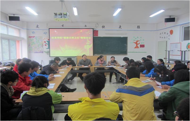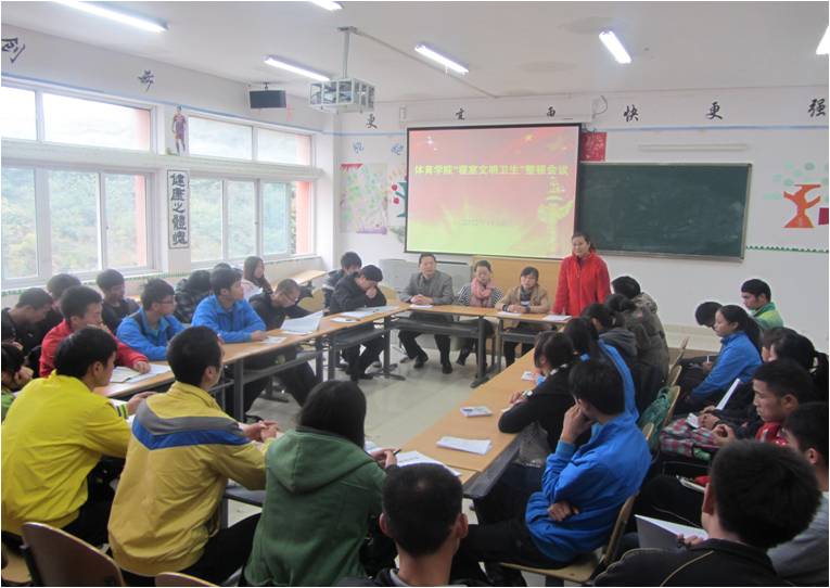 大会由辅导员冯进主持,会议的目的,是针对近期以来,发现在学生宿舍清洁卫生差、存在不文明行等问题,特对我院学生寝室文明、卫生进行整顿。针对学生宿舍文明和卫生问题,黄天明书记强调:“我们同学要积极的关注自身的生活环境,优化我们的生活、学习环境,创建和谐、卫生、文明寝室;严禁同学在宿舍有酗酒、赌博和打架斗殴。”院长张竞红则从实际中要求:“学生党员、团总支学生会干部、各班团支部班委要以身作则,做好榜样作用,带动同学把体育人的精神落实到学习、生活、工作中。”