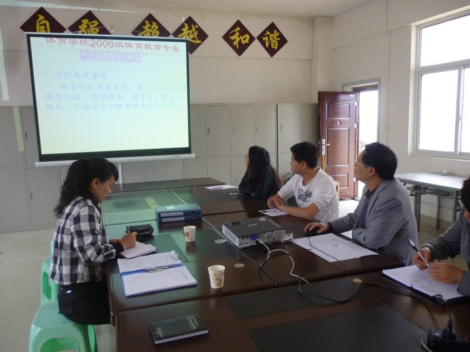 2009级体育教育专业就业工作汇报会议。会议由黄天明书记主持,招生就业指导处的陆青副处长出席了会议。
