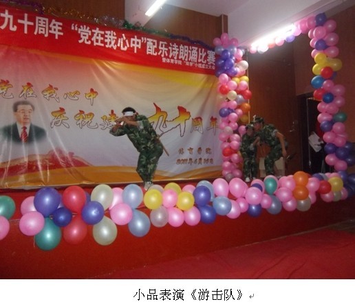 各班的选手们用饱满的情绪、生动的语言,进行了主题突出、内容丰富、热情洋溢的朗诵,表达了他们对党的生日祝福。此次比赛内容丰富,中间穿插小品、相声、独唱、笛子表演、互动等,来自2010级体育教育本科1班的小品表演《游击队》把整个比赛推向高潮。参赛选手们声情并茂的朗诵,博得了现场观众的阵阵掌声。