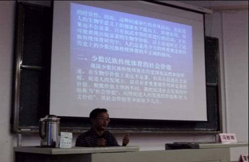 在此次讲座中,来自贵州师范大学的冯胜刚教授对我国少数民族传统体育的分类、价值及发展方向三个方面进行了详细的阐述。冯胜刚教授在讲座中旁征博引,谈古论今,把抽象的体育理论知识以形象的语言加以描述,他独特的讲授风格给大家留下了深刻的印象,精彩的演讲不时引发出热烈的掌声。