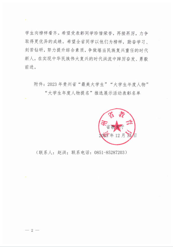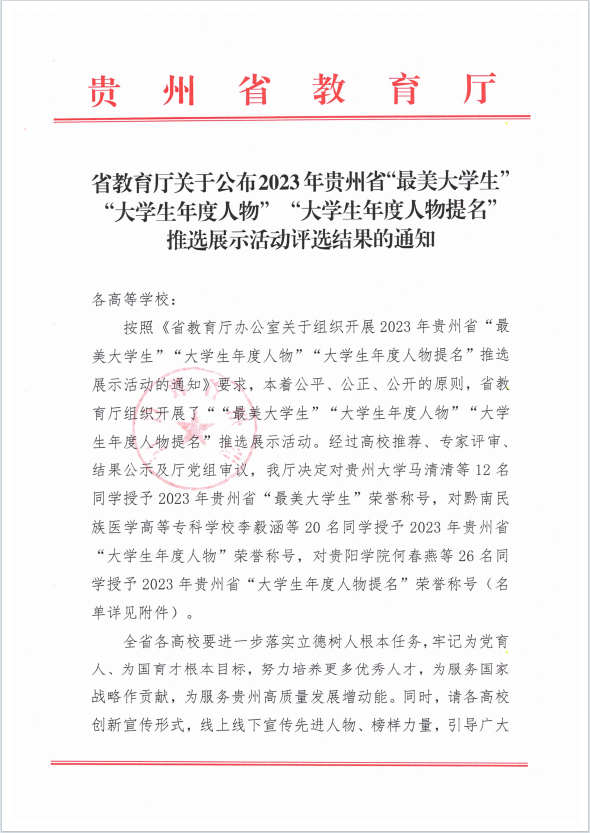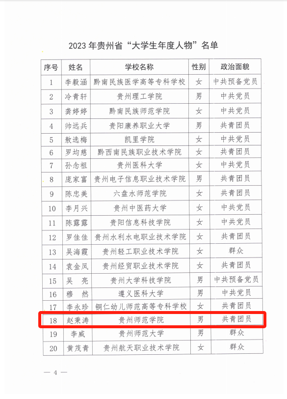 我院2020级休闲体育专业赵秉涛同学,荣获2023年贵州省“大学生年度人物”荣誉称号。