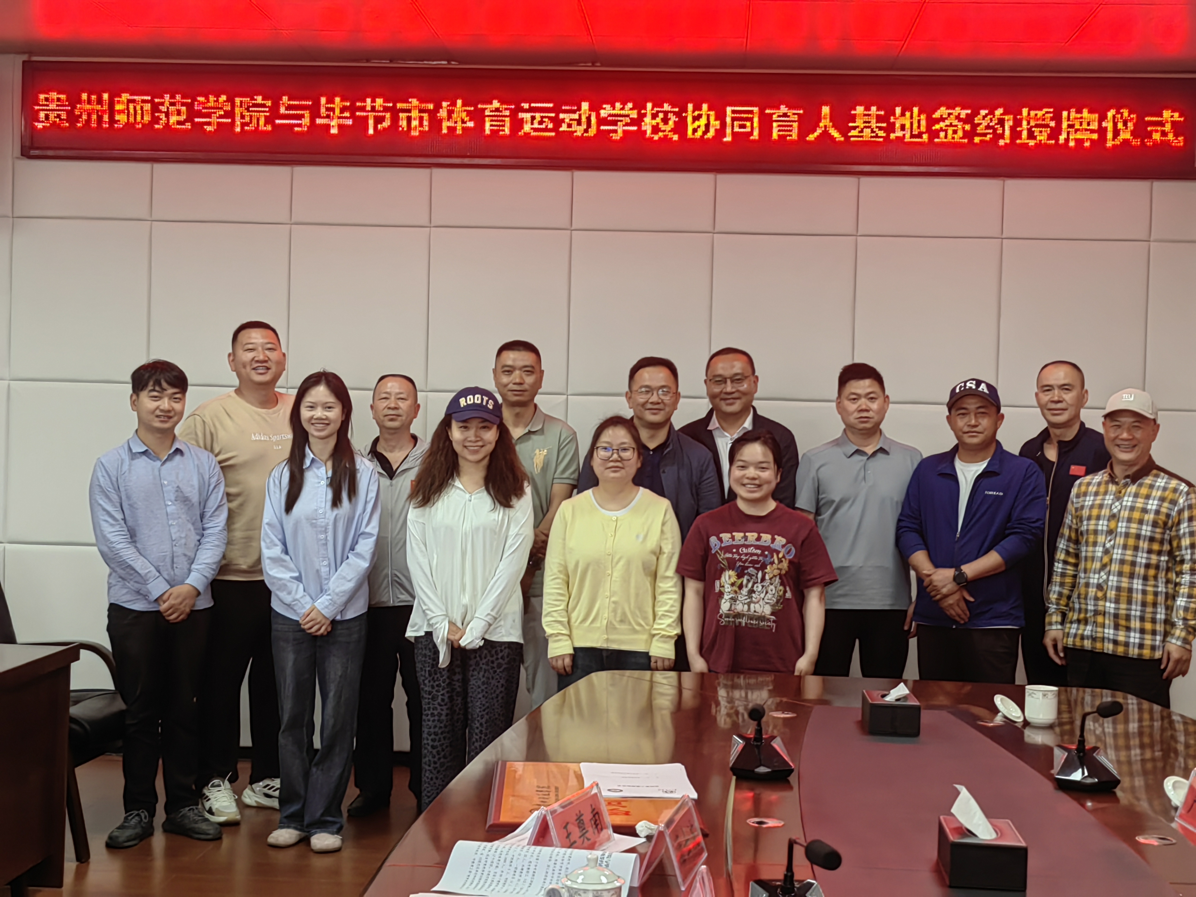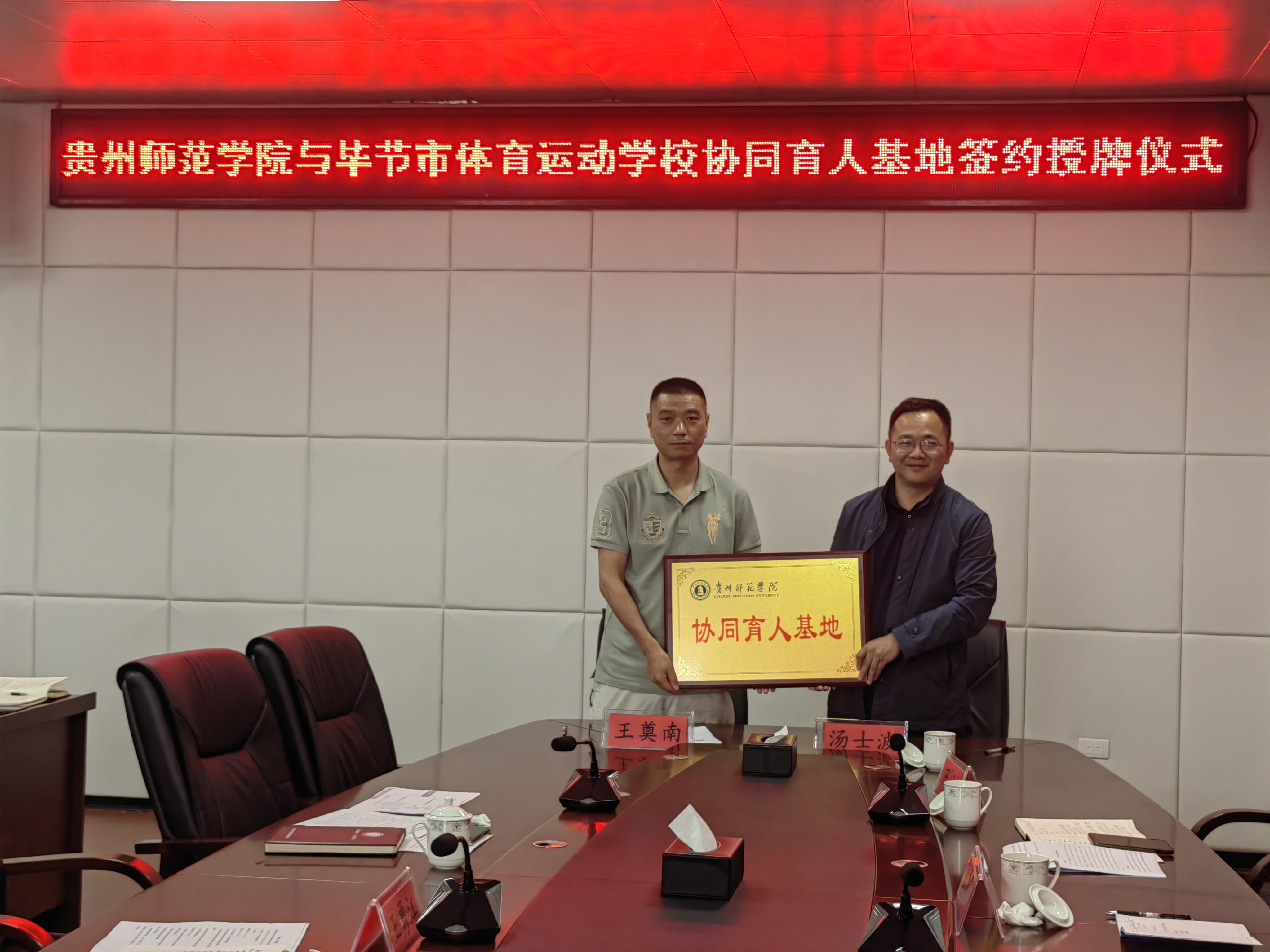 党委书记汤士波与毕节市体育运动学校校长王奠南签订“协同育人”协议并授牌。