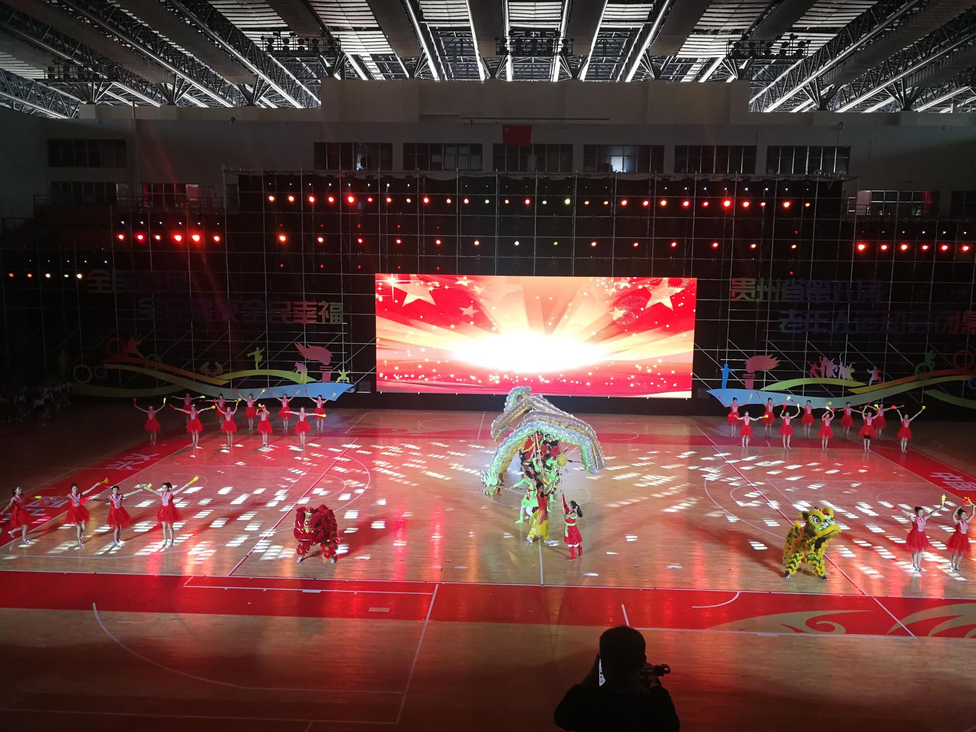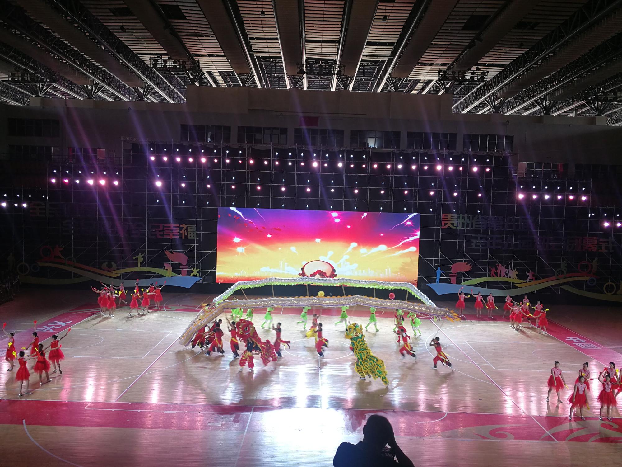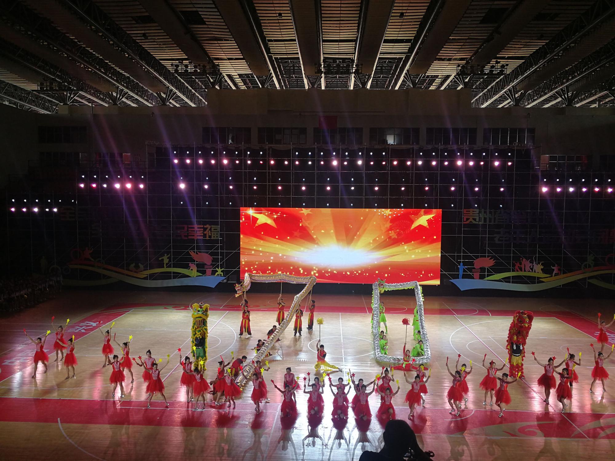 我校龙狮队受黔西南州体育局之邀参加闭幕式,由黄伟明院长、张昕老师及卢霞、张国祥两位助教同学带队参加了此次闭幕式表演。作为第一个开场的节目,主持人隆重介绍了我校的发展和龙狮队伍所取得的成绩。在舞台上龙狮表演套路编排新颖,音乐节奏感强,动作精彩,栩栩如生、惟妙惟肖。龙时而腾飞、时而婉转、时而追珠。狮子时而惊疑、时而嬉戏、时而活灵活现。龙狮的精彩表现赢的了台下的观众阵阵叫好和热烈的掌声。表演结束时龙狮摆出“70”的数字,来为新中国成立70周年献礼,也祝愿伟大的祖国越来越美好。