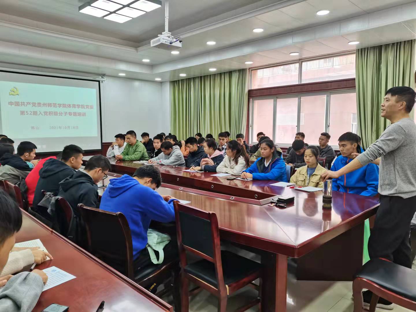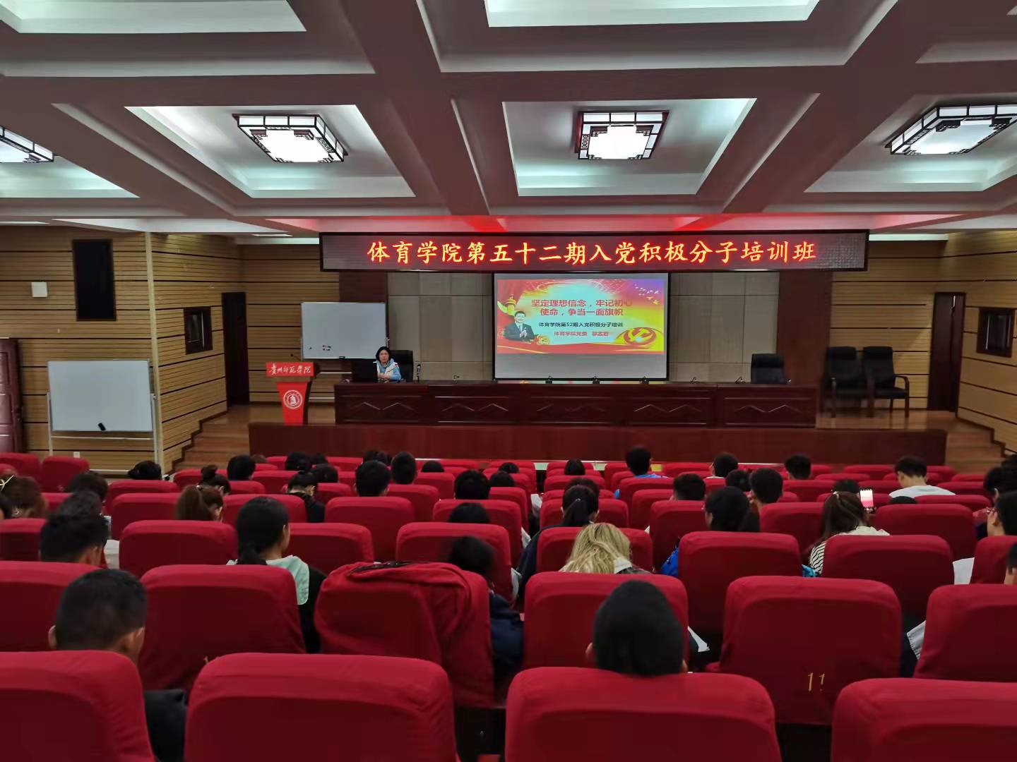 10月20日中午,院党委副书记邬孟君主持主讲了专题讲座第四讲。邬孟君以“中国共产党的性质”,“中国共产党的指导思想”,“中国共产党的奋斗目标和基本路线”,“中国共产党的组织原则、纪律、优良传统”为主题,围绕党的优良作风和各种英雄人物的事迹,以图文并茂的形式教导学员,并激励大家要争做时代先锋,以一名党员的标准,严格要求自己,争取早日入党。