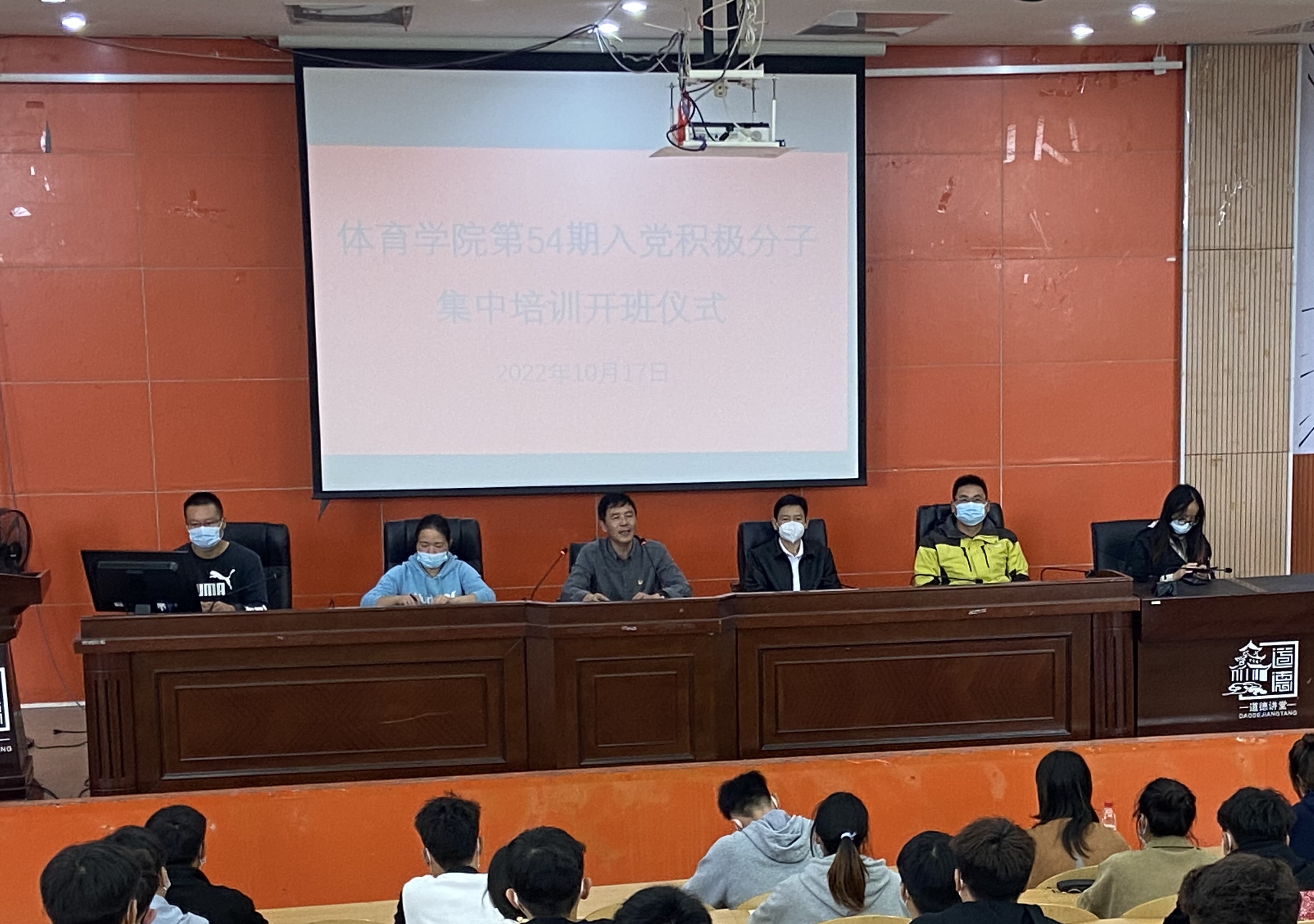 第54期入党积极分子集中培训在文韬苑学术讲堂顺利开班。学院党委书记韩山,党委副书记邬孟君,党委委员、副院长李延武,党委委员、副院长朱继伟,党委委员、副处级组织员刘华伟、以及体育教育系学生第二党支部书记陈思娜出席了培训班开幕仪式;参加本期培训班开幕式的还有院团委主要学生干部、54期全体入党积极分子。开班仪式由刘华伟主持。