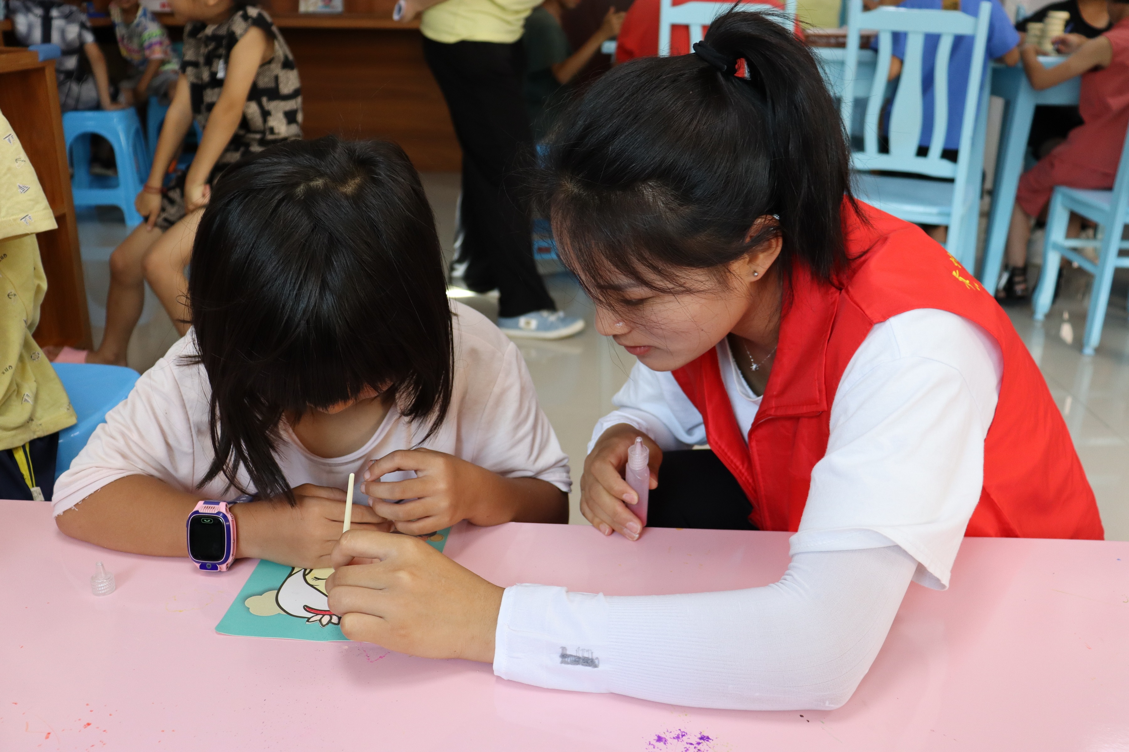 志愿者和小朋友一起绘画