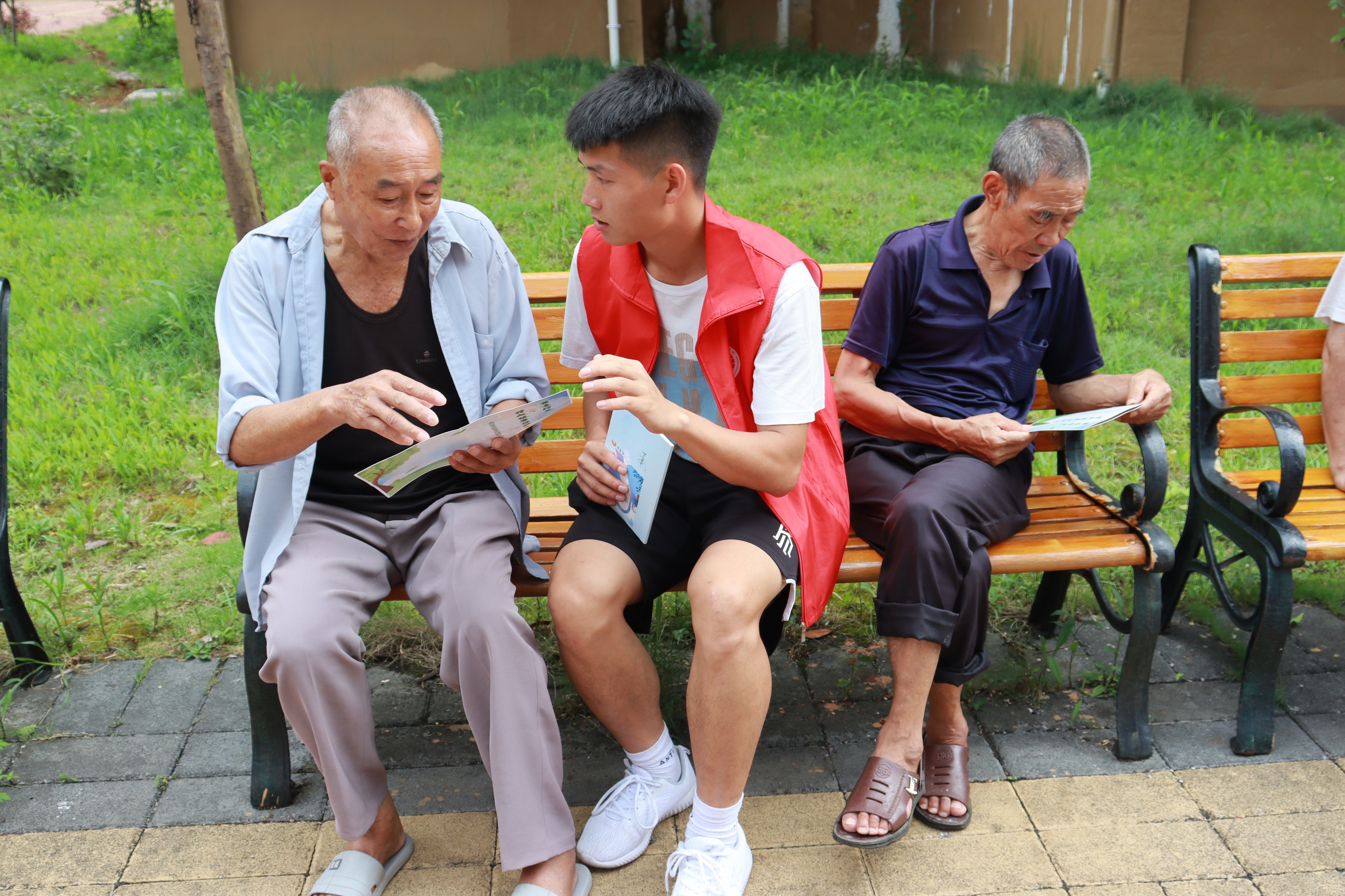 志愿者在社区为居民科普并发放宣传手册