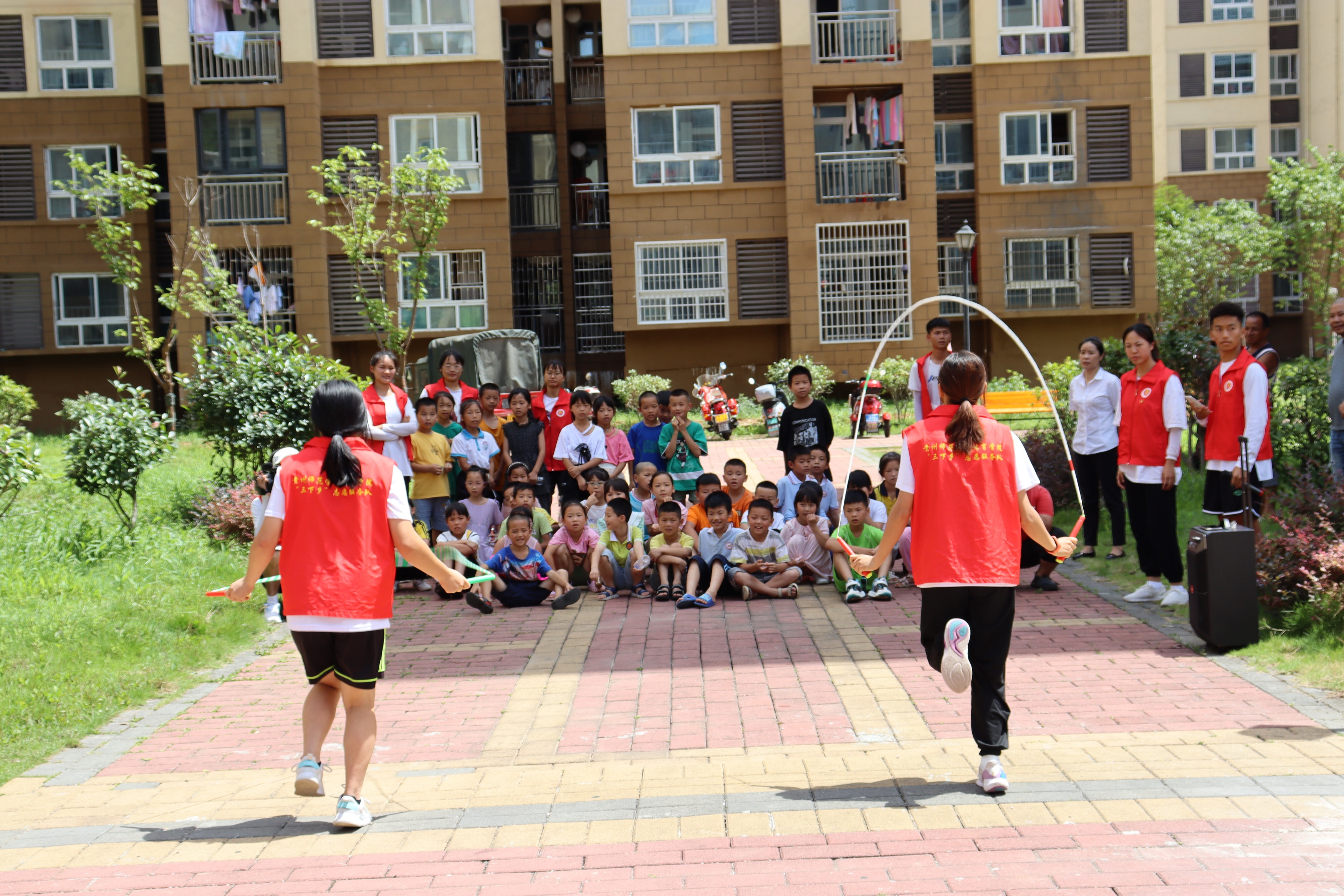 社区里的小朋友在观看花样跳绳表演