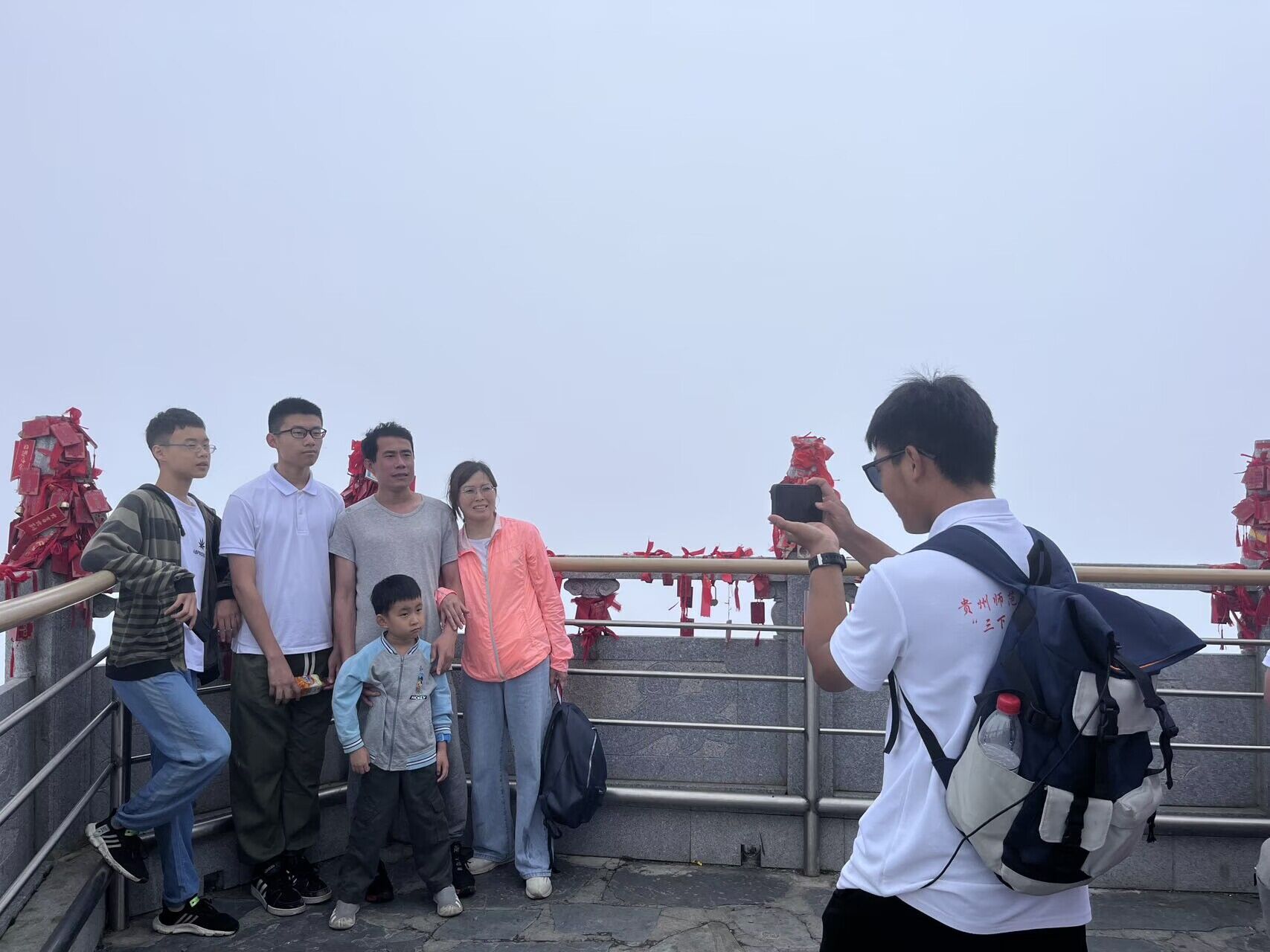 上午,志愿者乘车前往景区,通过前一天的实践,志愿者们对于梵净山景区的路线有了一个大致的了解,沿途,志愿者还帮助了不会使用智能手机的老人预约了上下山索道。通过攀登,志愿者们来到了红云金顶的顶端,顶端上有两个大约100多平方的平台,平台中间都耸立一块巨石,巨石的傍边各建一庙,左为释迦殿,右为弥勒殿。这两座庙建于明朝。金顶有许多拍照留念的游客,志愿者们还帮助有拍照需求的游客拍照。