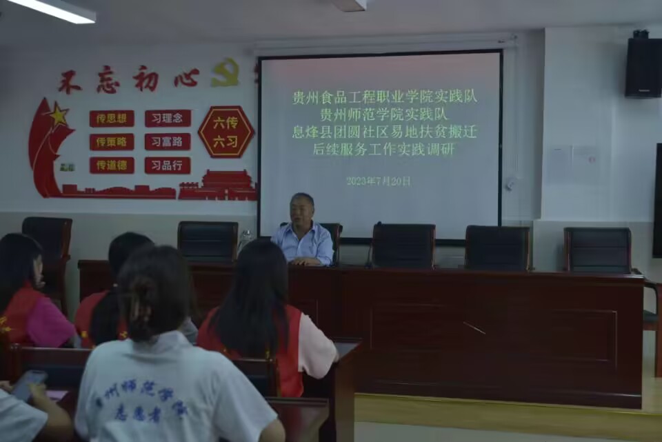 中国政府始终坚持从我国基本国情出发,将减贫、脱贫作为国家发展的重要目标和任务,贯彻实施精准扶贫、精准脱贫基本方略,为世界减贫事业做出了新的贡献,也为早日实现世界奔向小康生活做铺垫。2023年7月20日早上11:00息烽县团圆社区异地扶贫搬迁团委指挥部书记王敬奎在百忙之中来到社区会议室现场与高校下乡学子沟通交流。王敬奎书记对星跳公益志愿服务队的到来表示热烈的欢迎,讲解了团圆社区搬迁的时间、由来和一些工作中的困难,由衷的感谢党的政策,并在管理社区的日常工作中都传递着爱党爱国的情怀,希望星跳公益志愿服务队在支教的过程中能够继续在孩子们中传递“感党恩、听党话、跟党走”的信念,为实现中华民族的伟大复兴奉献体育力量。