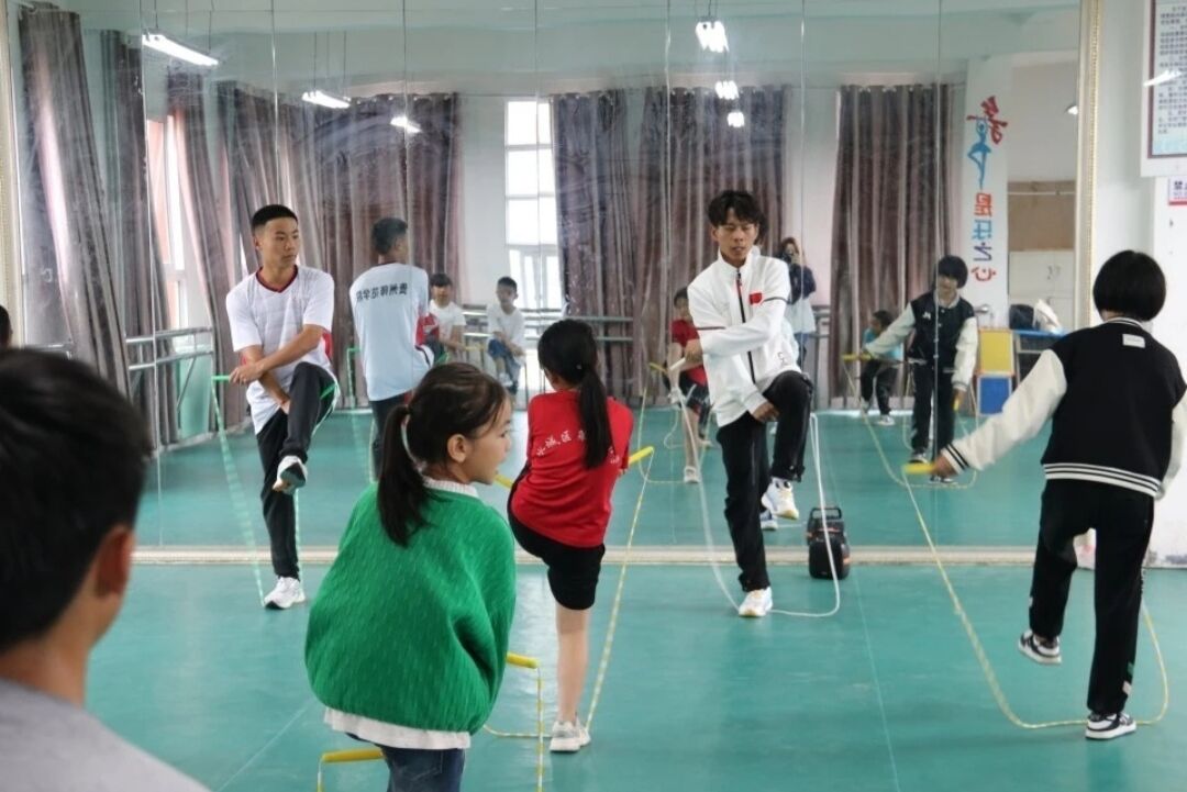 随后,志愿者们将水城区第二小学的学生们根据运动水平分为两个小队,一个小队是水平较好的学生组成跳绳训练队,一个小队是跳绳基础较差的学生组成体验乐趣队,两个小队的学生分场地不同教学。跳绳训练队的学生主要学习内容是跳绳速度练习与花样跳绳双摇动作的练习,体验乐趣队的学生主要学习内容是观看花样跳绳表演视频、学习握绳柄摇绳动作姿势、双腿并脚跳等。体育强则中国强,国运兴则体育兴,训练场上水城二小的同学们积极认参与花样跳绳的学习互动,欢笑的面孔透露出他们对知识的渴望和未来的向往。