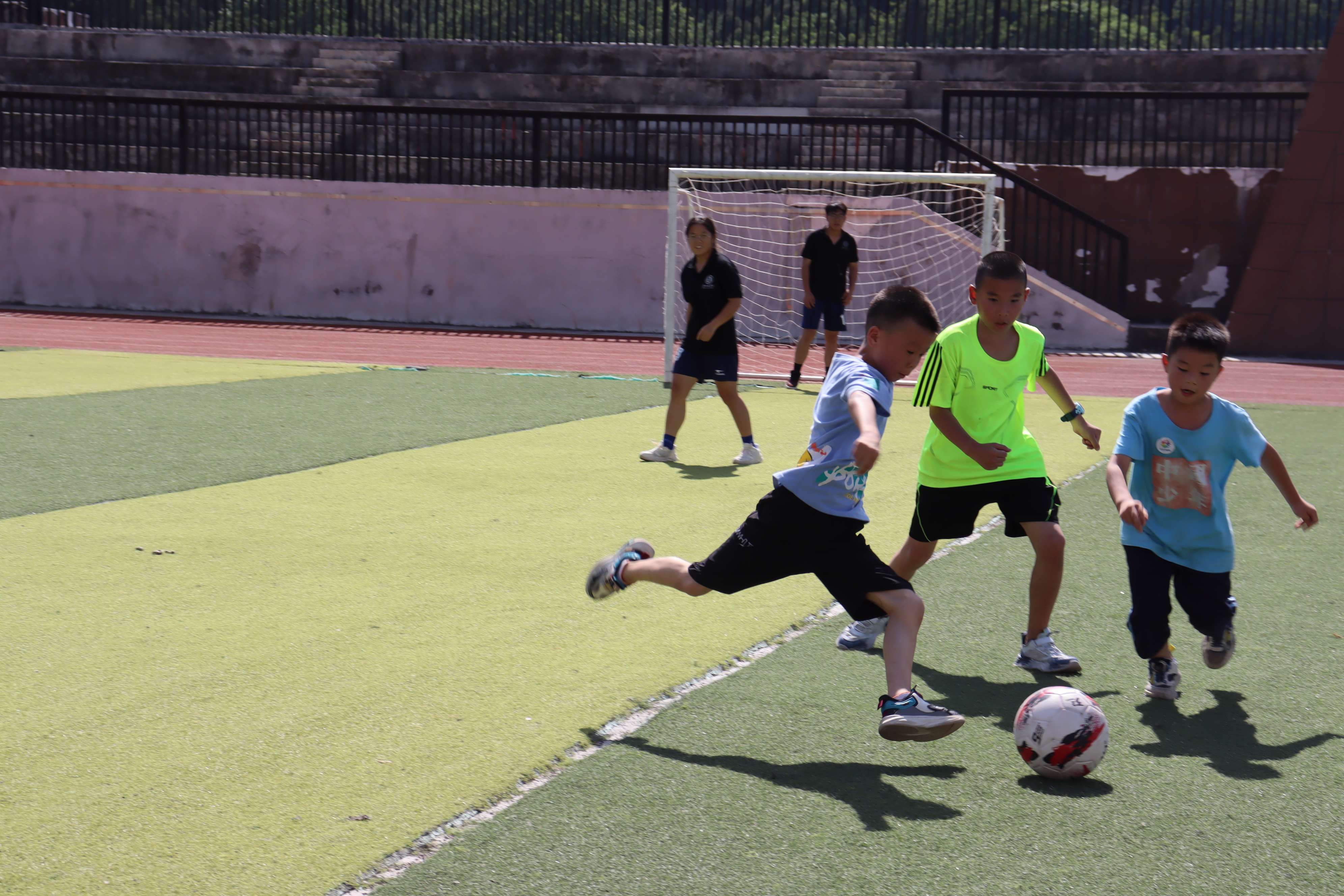 阳光明媚,天空正蓝,一节为三年级孩子精心准备的足球课正在江口县第五中学操场上如火如荼地进行着。小小守门员与队员们之间的相互配合成为了操场上靓丽的一道风景线。守门员目光专注,身姿矫健,时刻准备着迎接对方球员的进攻。队员们则勇敢拼搏,与守门员紧密呼应。每一次的防守和进攻,都展现出他们之间逐渐培养起来的默契。而在这精彩的背后,离不开老师的引领。专业的体育老师穿梭在孩子们中间,耐心地指导着每一个动作,不断地给予鼓励和纠正。在老师的悉心教导下,孩子们不仅掌握了足球的基本技能,更明白了团队协作的重要性。
