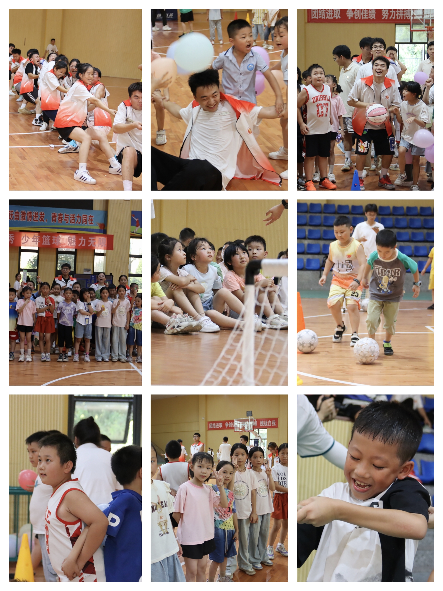 在篮球碰碰碰比赛中,参赛的同学铆足了劲将篮球砸向篮板,努力让篮球回弹落地后碰到奖品,学生在得分后兴奋地和志愿者拥抱庆祝。比赛过程精彩纷呈,现场气氛十分热烈。
