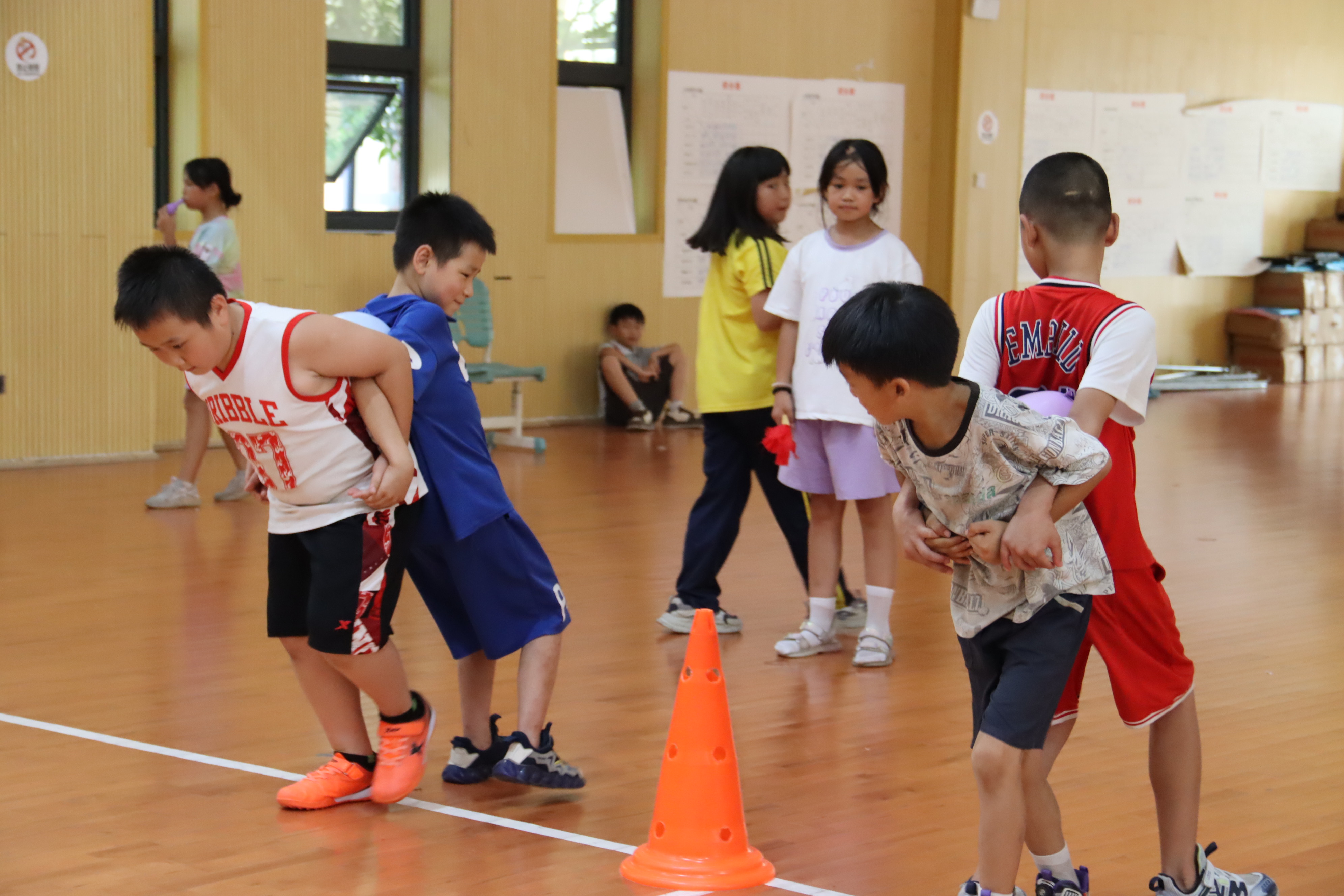 在背夹气球比赛赛道,选手们两两一组,背靠背紧紧夹住气球,小心翼翼地向前移动,既要保持气球不落地、不被挤破,又要尽可能快速地冲向终点,各个组合步伐整齐,默契十足,气球被稳稳地夹在中间,你追我赶,乐此不疲。