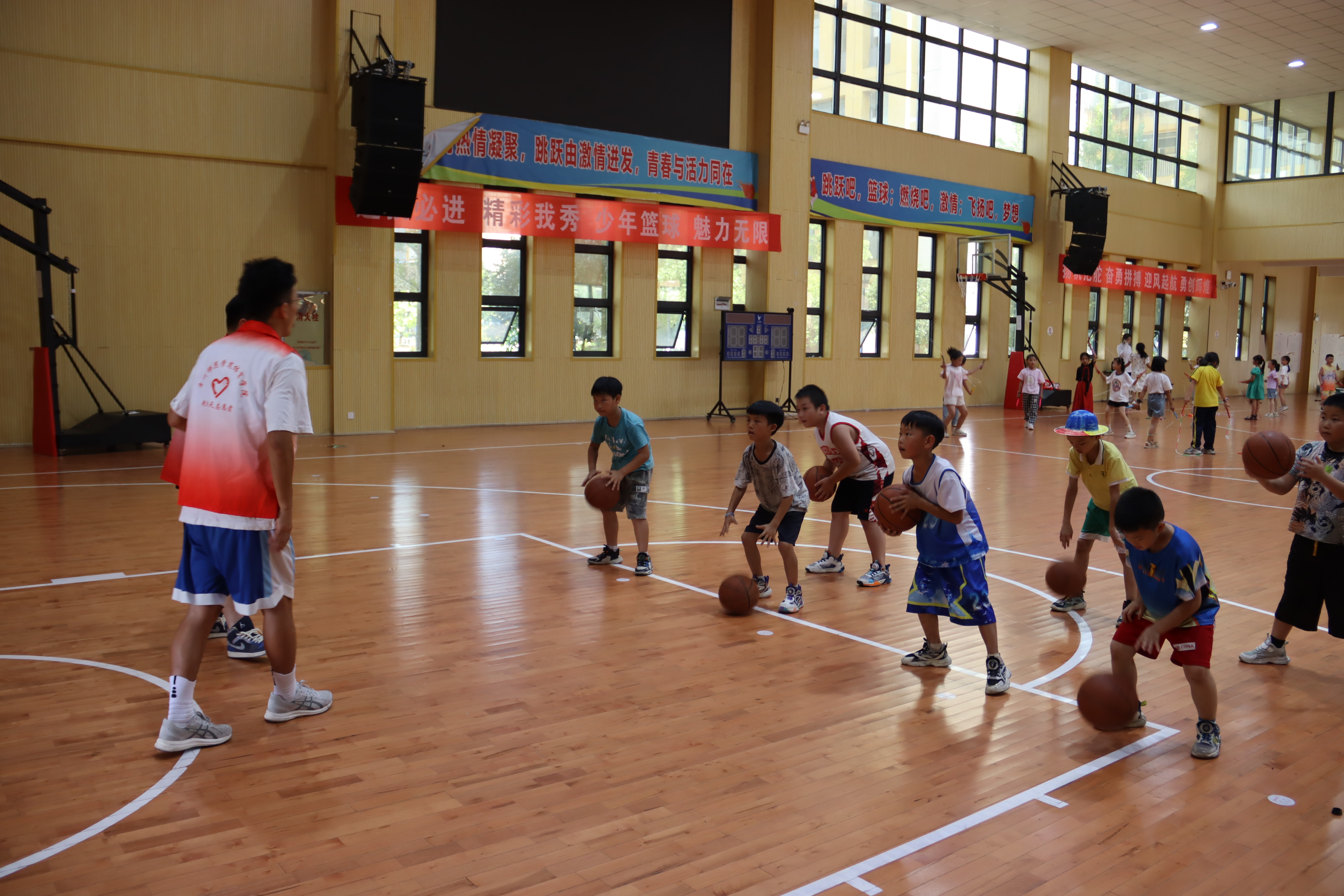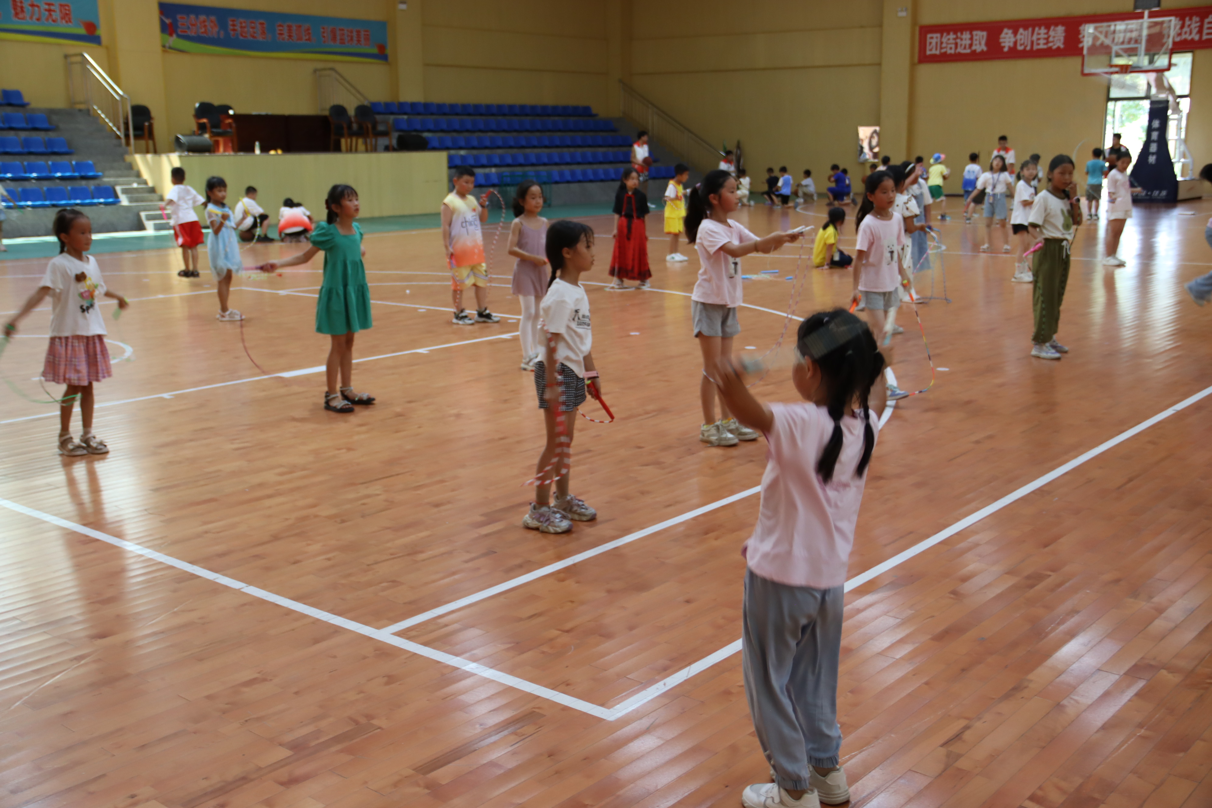 下午志愿者带领孩子们进行汇报演出的排练,花样跳绳志愿者亲自示范各种复杂跳绳技巧,如单脚跳、双脚交替跳、交叉跳等。孩子们紧紧跟随,手中的跳绳在空中划出一道道美丽的弧线,跳跃的脚步轻盈而敏捷,他们的脸上洋溢着专注与快乐。另一边,篮球操的排练也在如火如荼地进行着。志愿者们首先进行分解动作的教学,从运球、传球到拍球转身,每个动作都一丝不苟地演示。孩子们手捧篮球,认真地模仿着志愿者的动作,眼神中充满了对表演的期待。随着音乐的节奏响起,孩子们整齐划一地拍动篮球,篮球与地面的撞击声如同欢快的鼓点,奏响了青春的旋律。志愿者们穿梭在孩子们中间,不断纠正动作、给予鼓励,汗水浸湿了他们的衣衫,但他们的热情丝毫不减。孩子们也相互帮助,共同进步,整个排练场充满了团结和友爱的氛围。