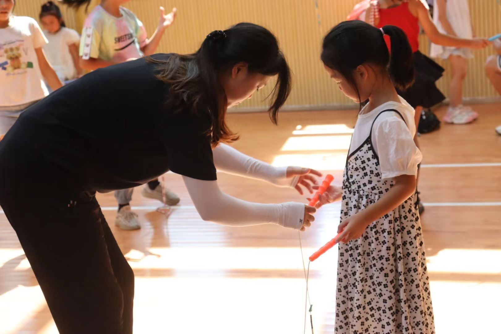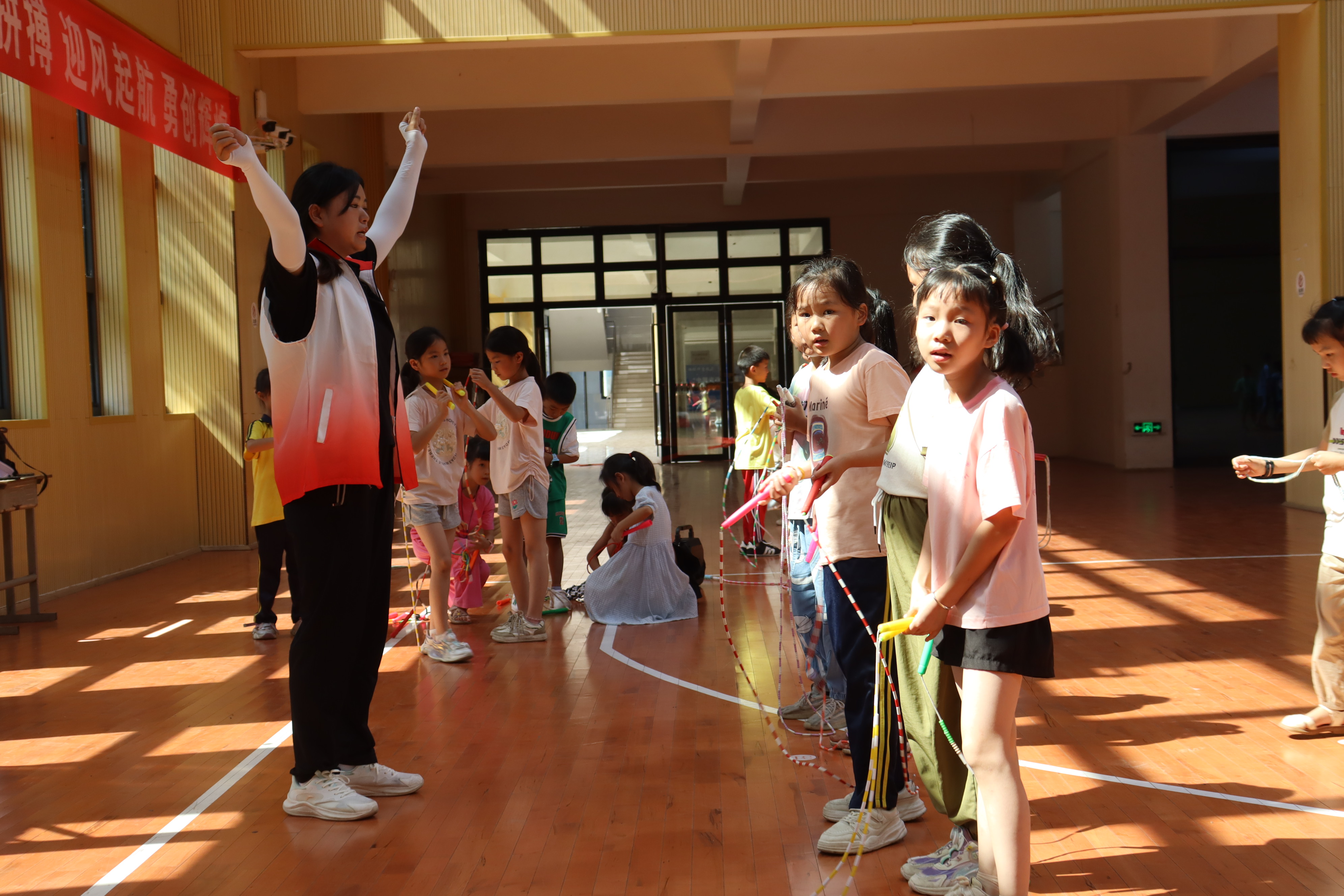花样跳绳课上,孩子们与自己手里的跳绳做朋友,互相适应,寻找默契。志愿者们通过对节奏、动作、姿势等方面的指导和示范,帮助孩子们掌握正确的跳绳技能,孩子们一边学习一边练习,充满了学习兴趣。孩子们挥动跳绳,变换着形式和动作,在笑声中越跳越熟练,越跳越快乐。