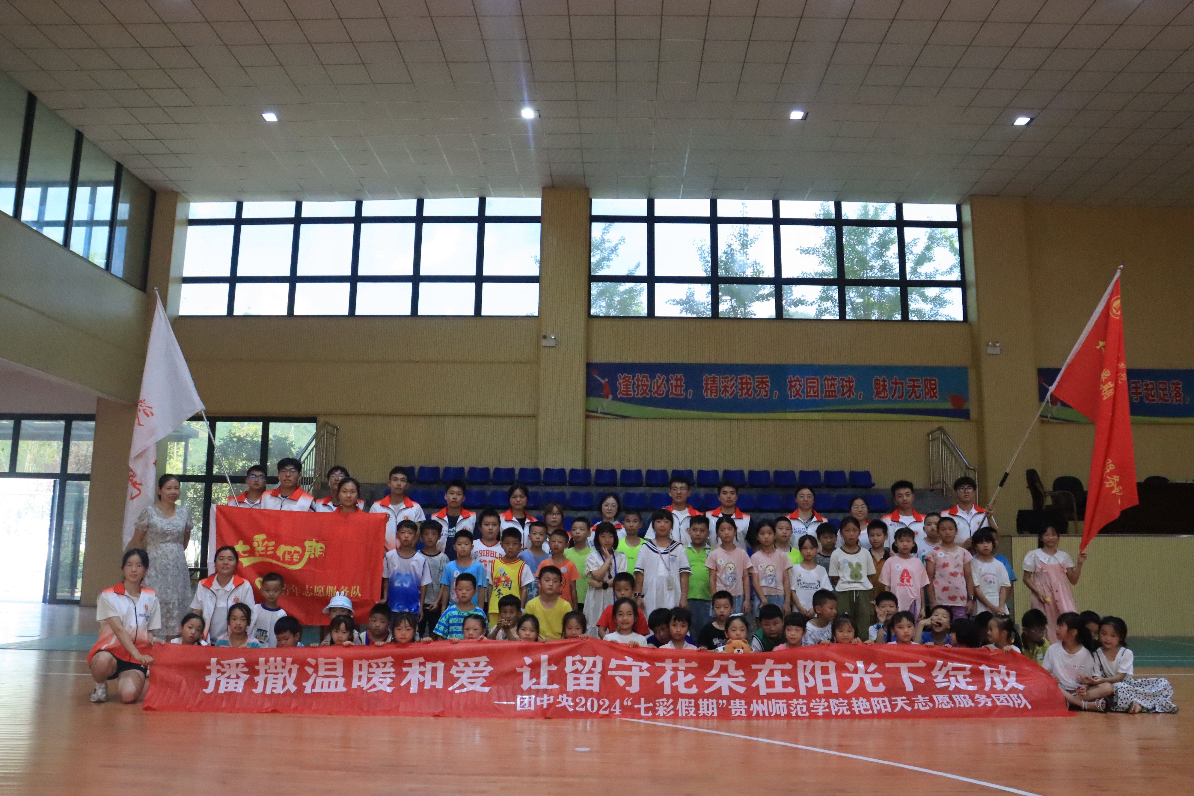 “艳阳天”志愿服务队全体成员赴贵州省铜仁市江口县梵瑞社区开展“七彩假期”活动的第二天。志愿者们在开展特色课程的同时,也关注学生们的身心健康。通过课堂活动和体育游戏等,向学生们传达生命可贵、心怀感恩和保持纯真等美德品质,也为志愿者服务注入积极向上的能量。