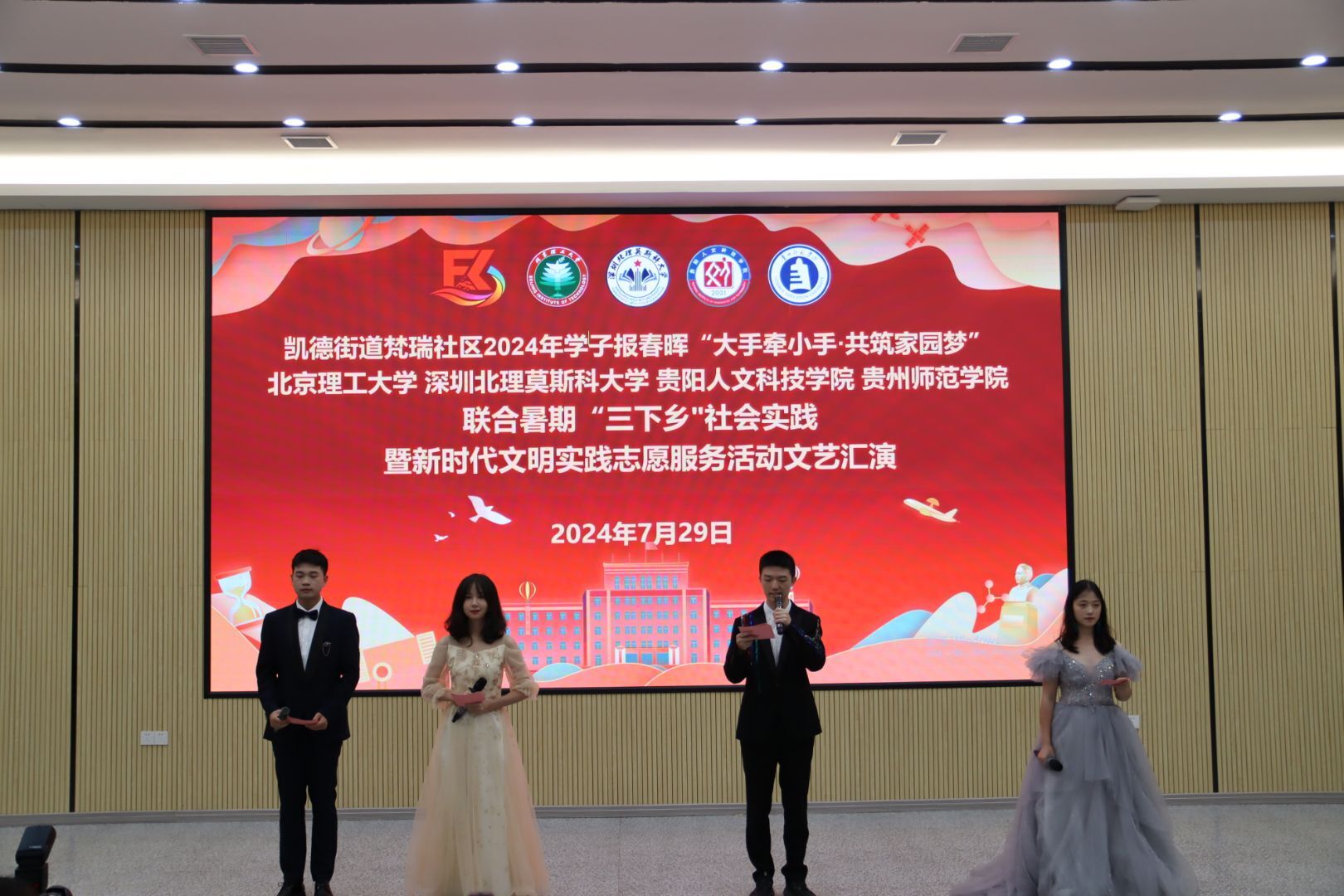 艳阳天志愿服务队联合北京理工大学、深圳北理莫斯科大学、贵阳人文科技学院,在江口县第五中学成功举办了一场以“凯德街道梵瑞社区2024年学子报春晖“大手牵小手·共筑家园梦”为主题的文艺汇演,标志着为期十天的暑期“三下乡”社会实践活动圆满落幕。此次晚会不仅是一场文化的盛宴,更是教育扶贫、关爱留守儿童、助力乡村振兴的生动实践。