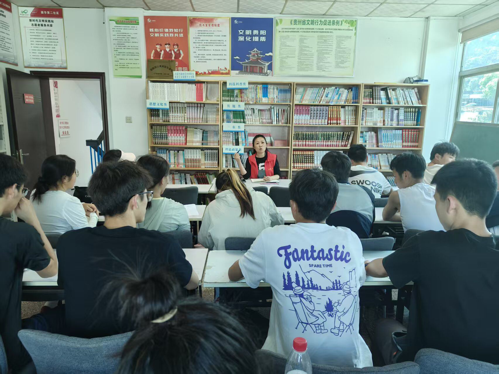 4月18日下午16:00时,全体团员抵达乌当区振华第二社区。杨再燕主持动员会议,介绍了“全民阅读·结对同行”的主题内涵,强调青年志愿者在传播环保理念、推动社区文明建设中的重要作用,并就岗位分工与安全事项作了安排部署。