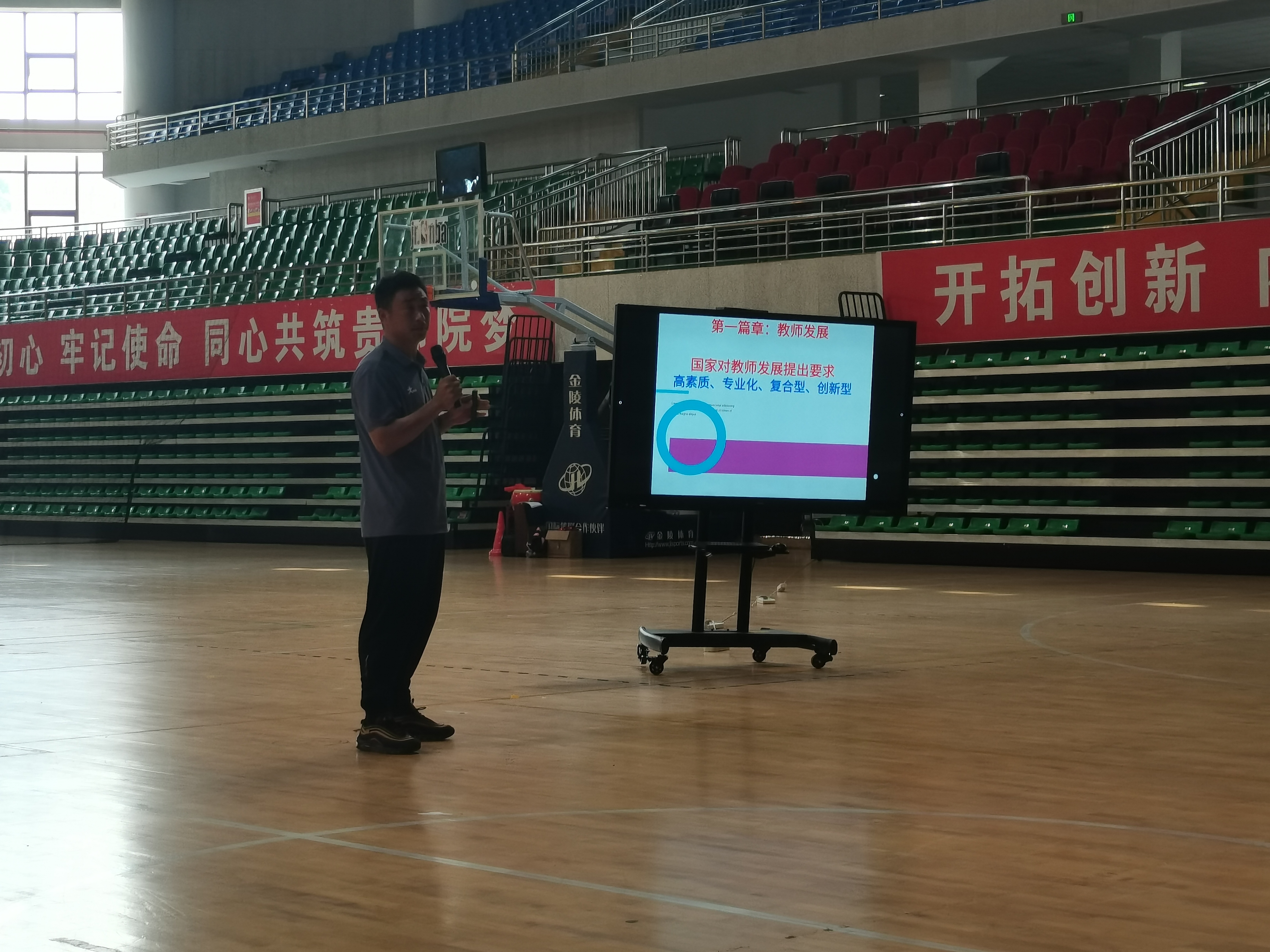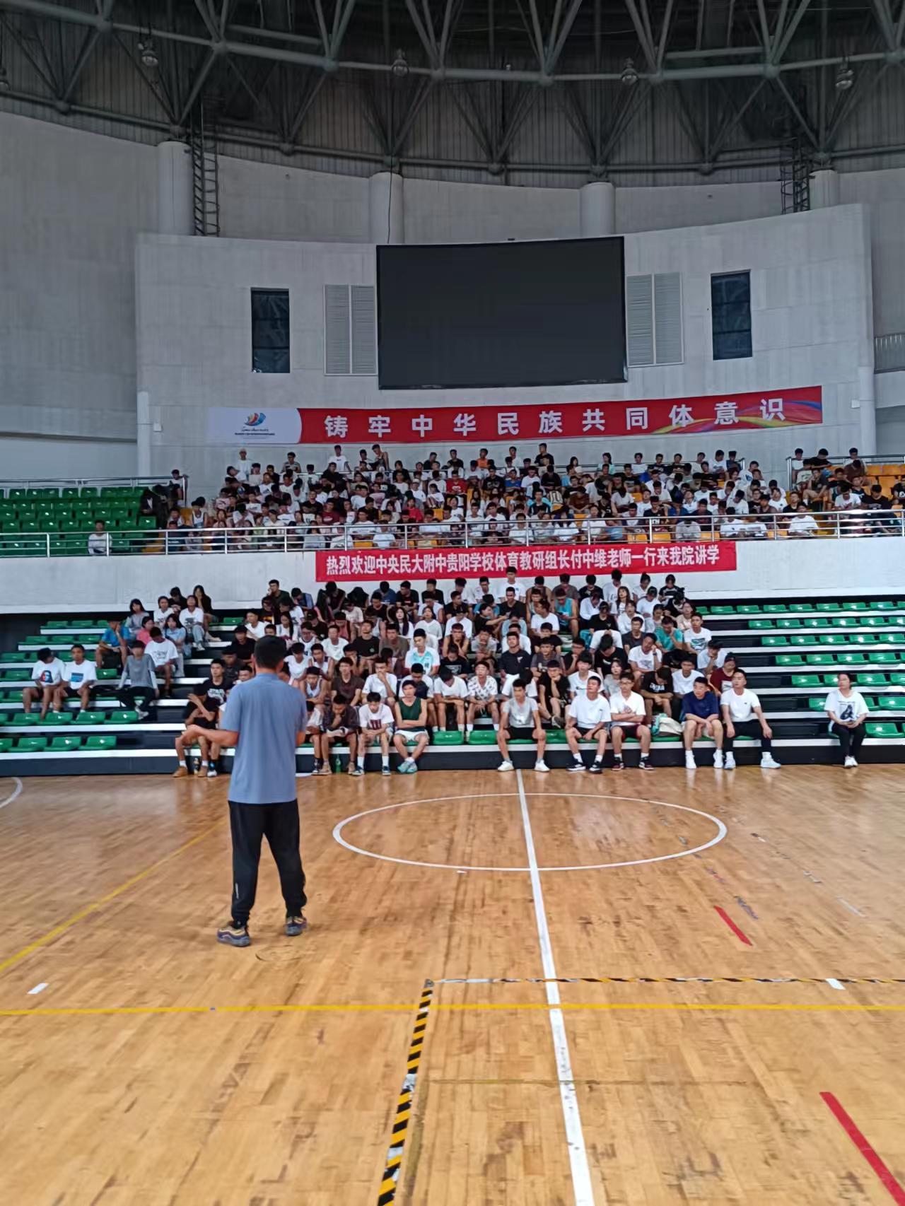 20级、21级体育教育专业的同学们整齐的坐在体育馆内,以热烈的掌声欢迎来自中央民大附中贵阳学校的付中维老师和肖岳老师到学校来讲学。