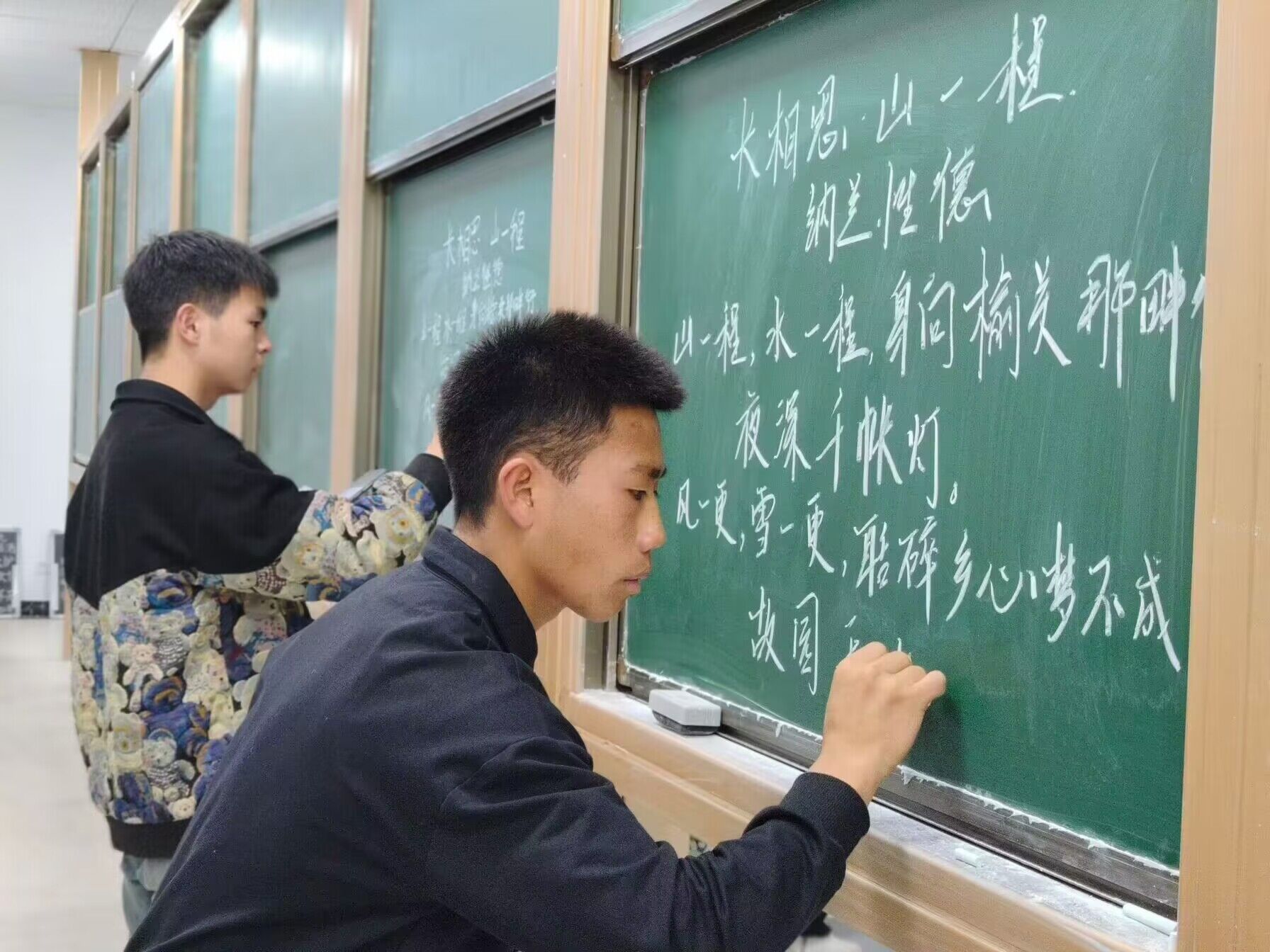 三字一话”即毛笔字、钢笔字、粉笔字和普通话,是师范类学生教学技能的基础。教师工整的字,漂亮的板书,标准的普通话,不仅体现了教师形象,更能给学生以潜移默化的示范作用。比赛现场各位同学按照参赛编号依此参加钢笔字、毛笔字、粉笔字及普通话应用四项展示。在“三字”书写比赛现场,选手们凝心聚力,全力以赴,在规定时间内,完成了一幅幅各具特色的作品。方正端庄的结构,线条优美的造型,风格各异的体势,内涵深邃的意境,无不凸显学生扎实过硬的教学基本功。普通话应用展示时,选手们更是沉着冷静、自然大方,以字正腔圆的发音、声情并茂的朗读展现出新时代教师风采。
