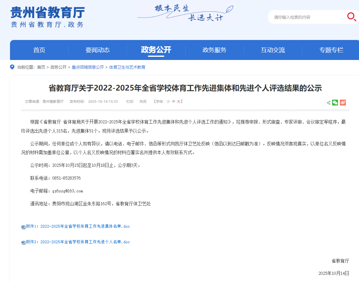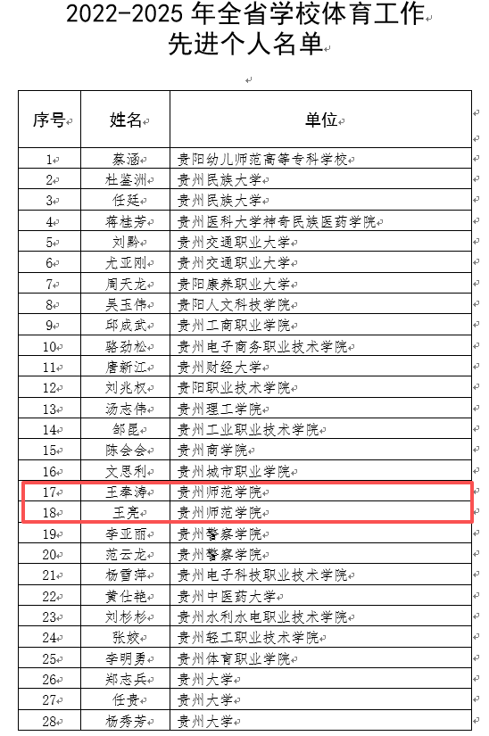 近日,贵州省教育厅公示2022—2025年全省学校体育工作先进集体和先进个人评选结果,51动漫 荣获“全省学校体育工作先进集体”称号,教师王亮、王奉涛荣获“全省学校体育工作先进个人”称号。