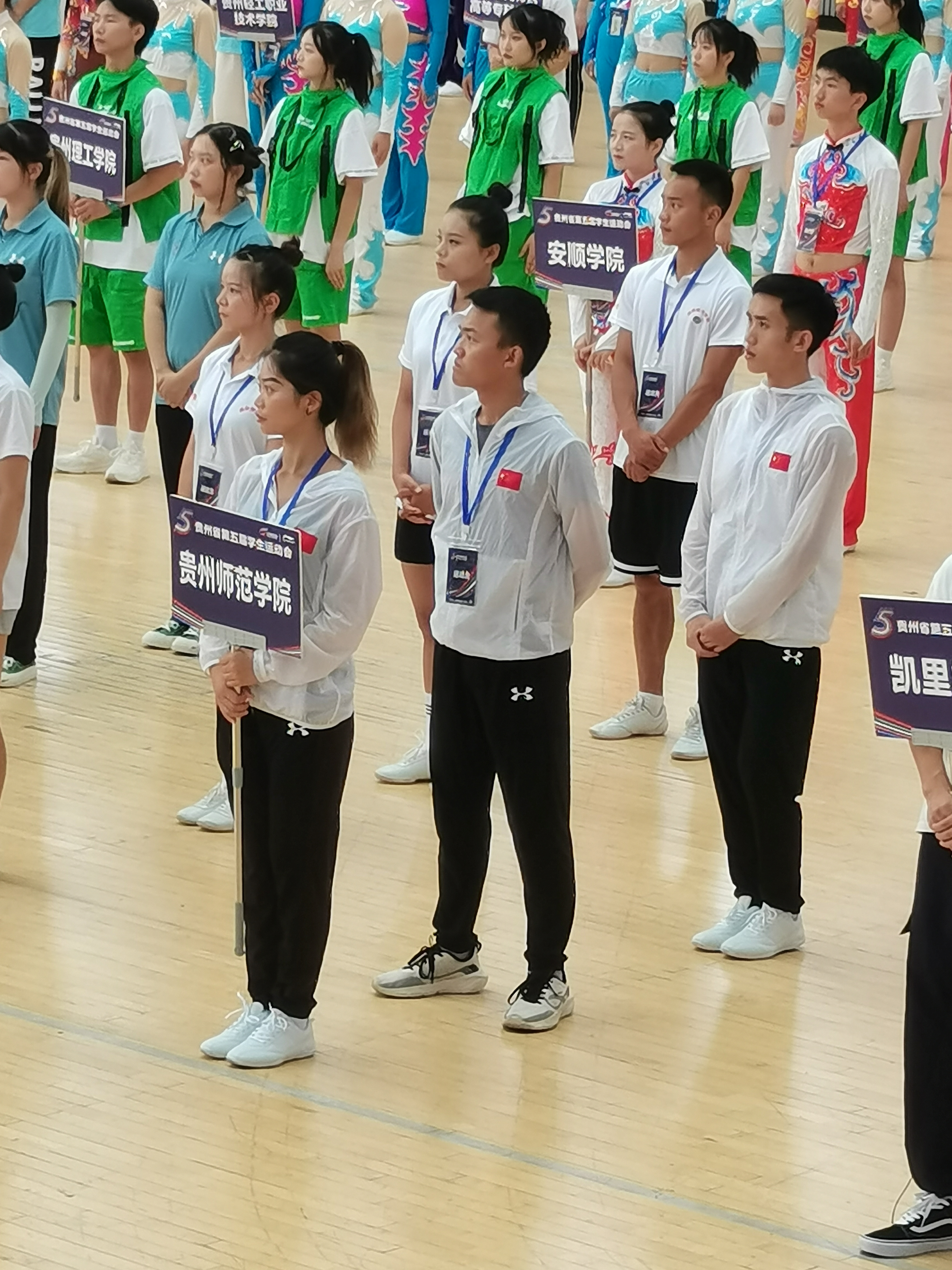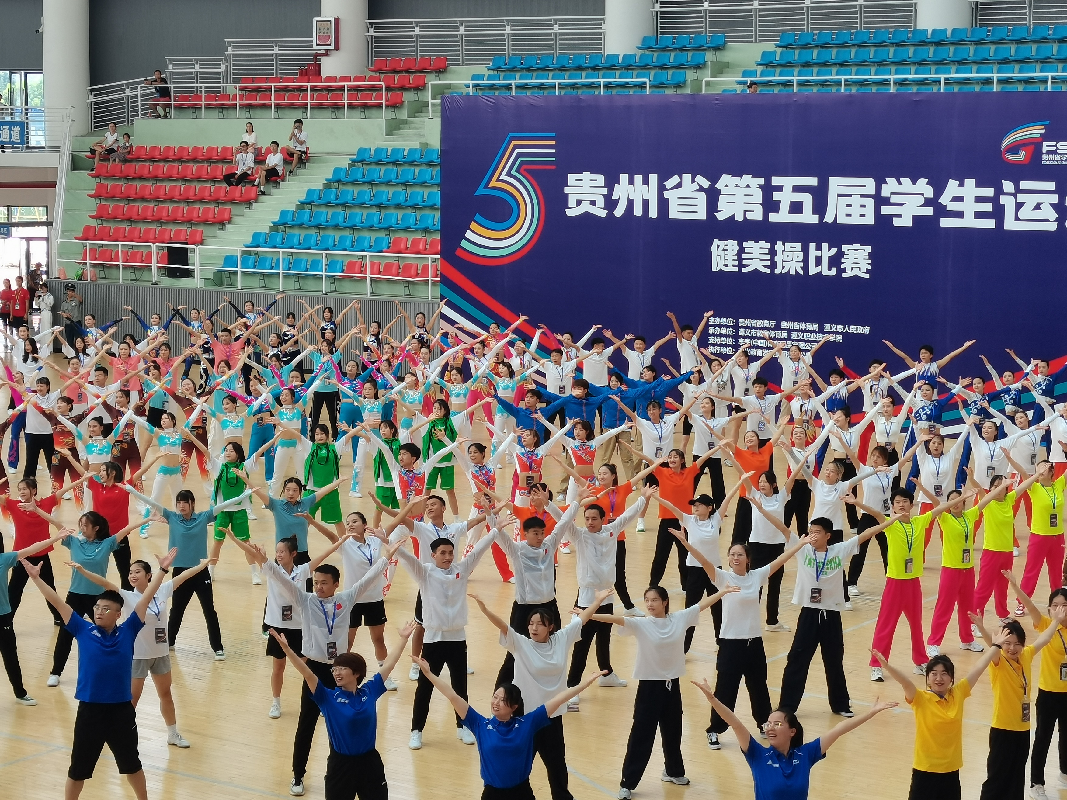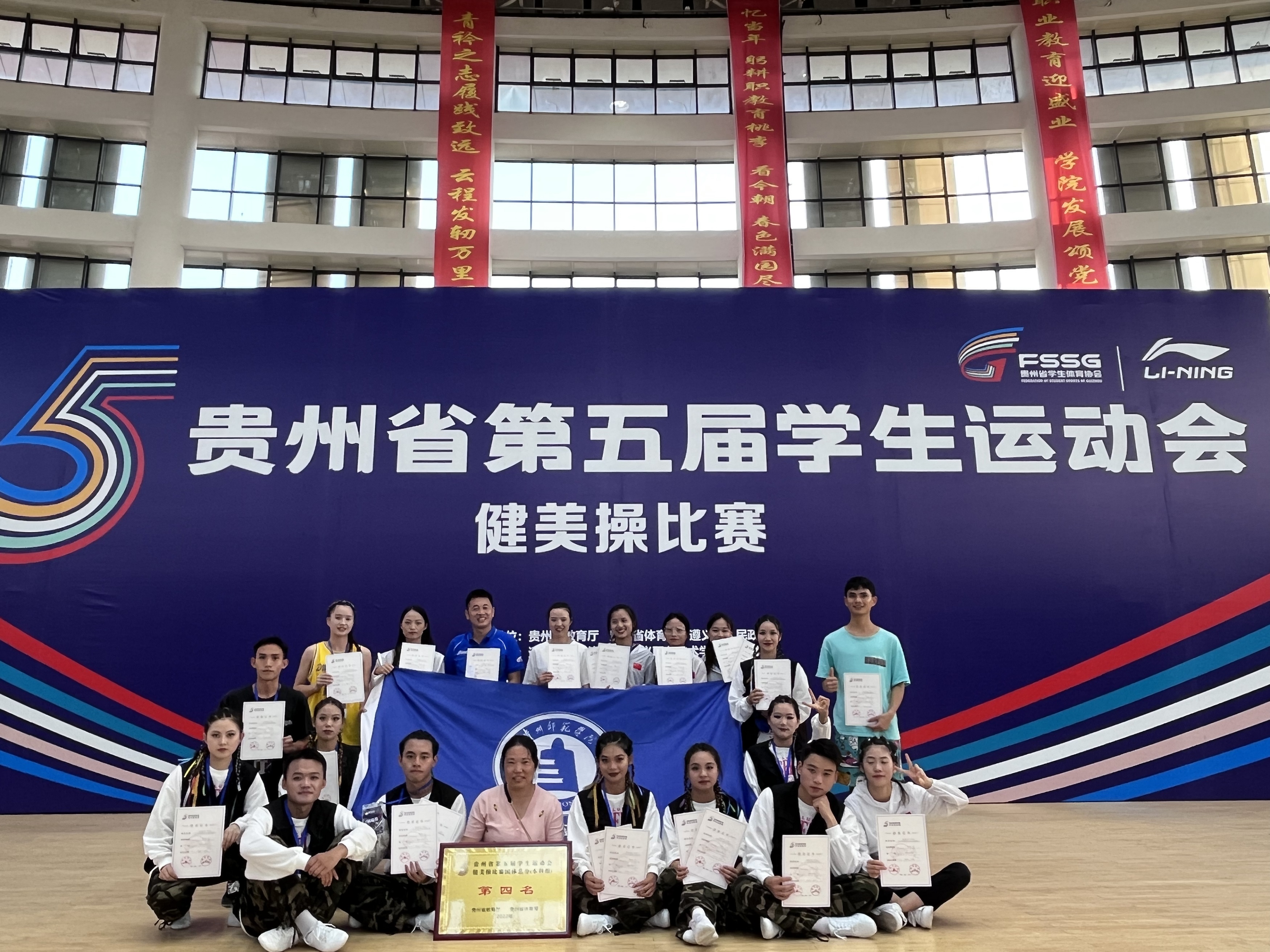 7月26日至29日在遵义职业技术学院举办的贵州省第五届学生运动会健美操比赛中,我校健美操队在领队邬孟君,教练钟春、胡静的率领下,与省内十余所高校同场竞技,参加了三个项目的比赛,其中2012全国健身操等级推广规定动作有氧舞蹈六级荣获二等奖,2017全国校园踏板操规定动作荣获三等奖,2020全国大学生街舞推广套路获得三等奖,另获团体总分二等奖的好成绩!