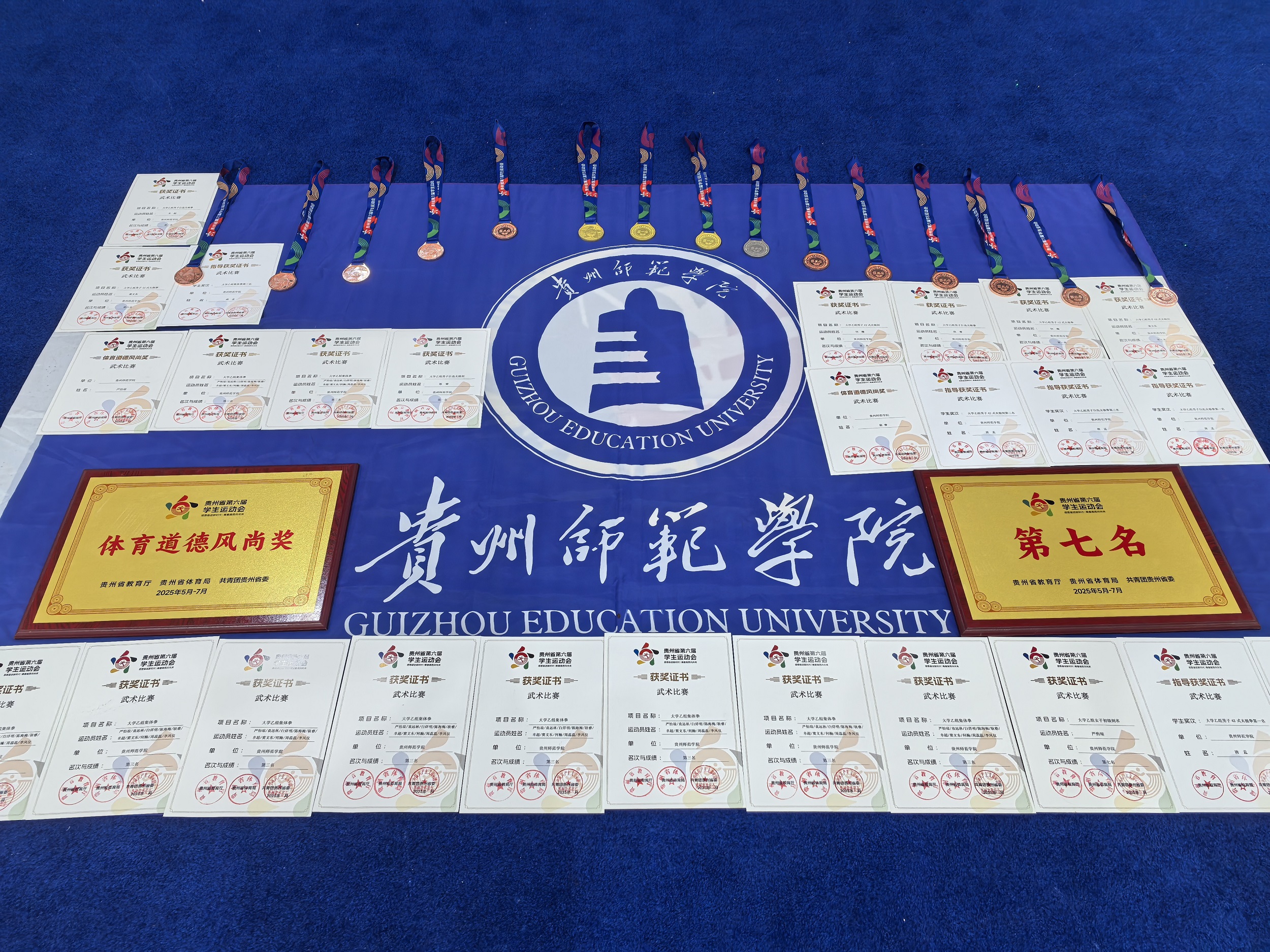 院长邬孟君为领队、唐孟老师任教练、体育教育专业10名同学为队员组成的代表队,参加了42式太极剑、初级刀、初级剑、初级棍、42式太极拳、自选太极拳、初级长拳第三路、段位制三段长拳、集体拳9个项目的比赛。运动健儿们凭借扎实的功底、灵动的身姿和顽强的拼搏精神,为学校夺得3金、1银、2铜、1项第六名、2项第七名,团体总分第七的好成绩,此外团队还被评委“体育道德风尚奖”、一名队员被评为“体育道德风尚个人”。
